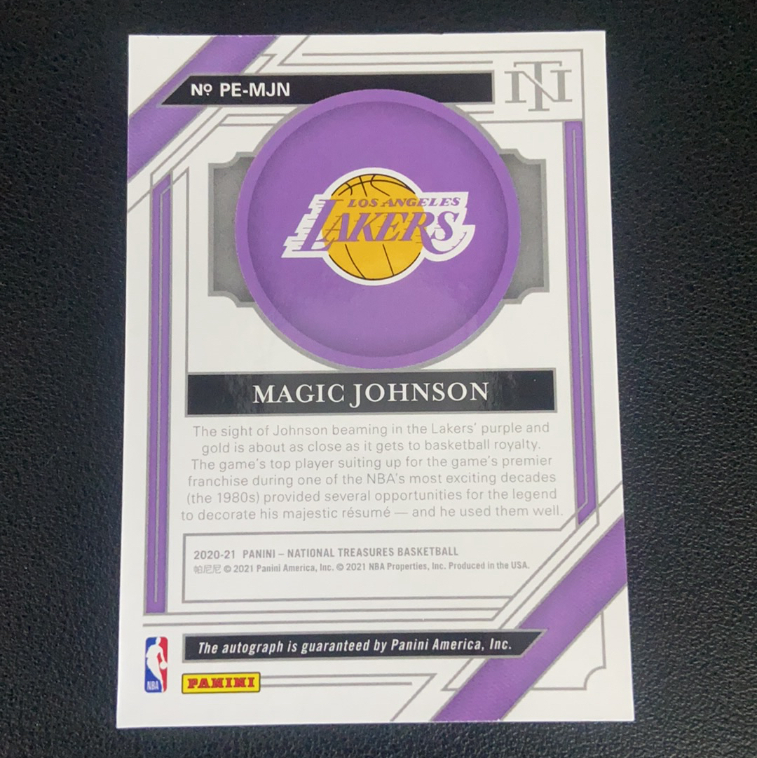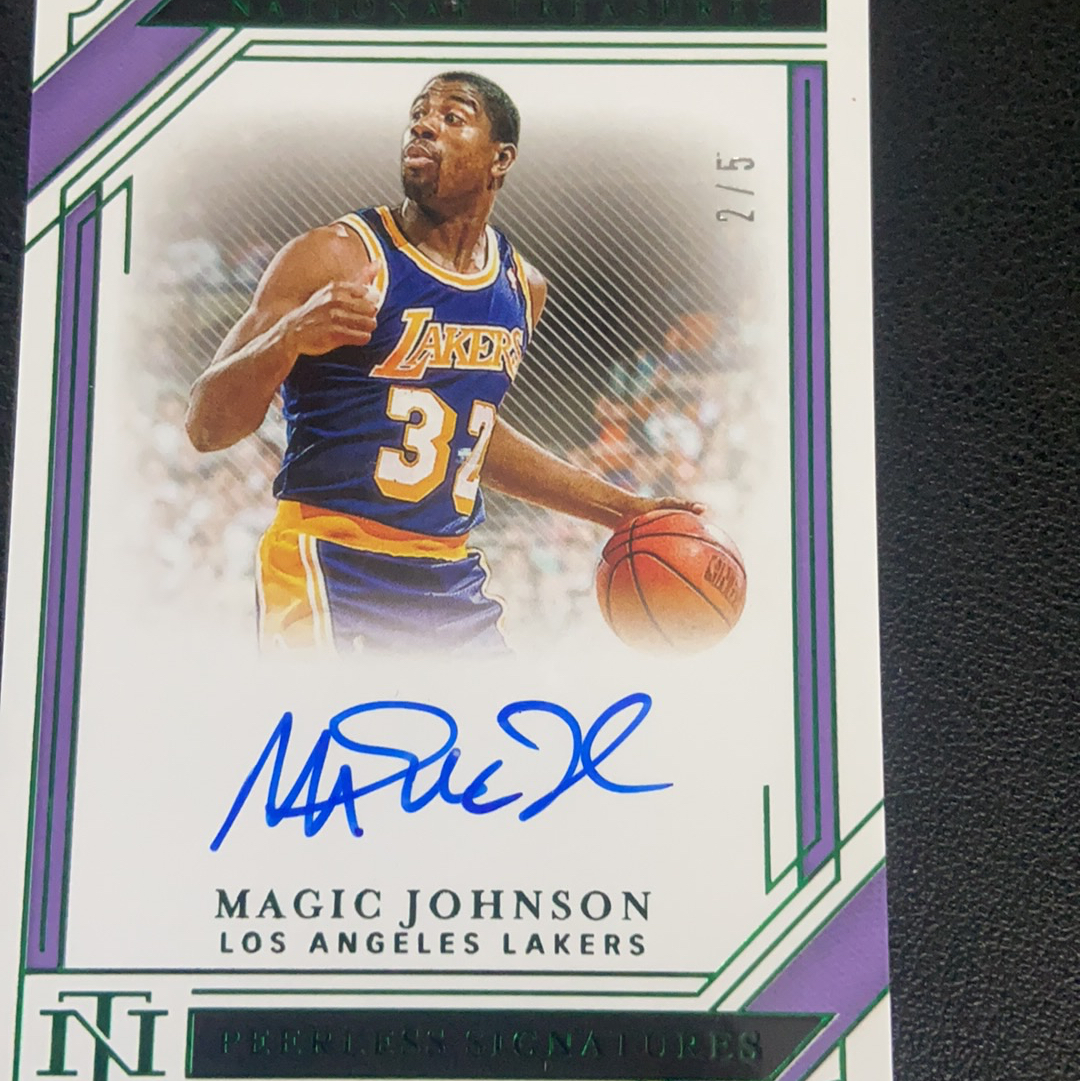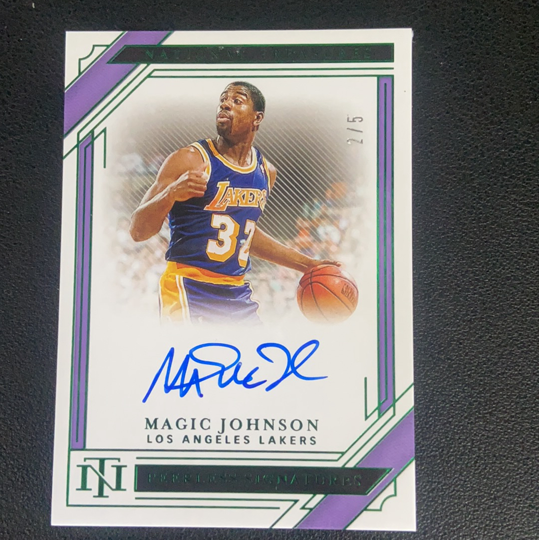 2020-21 Panini National Treasures Magic Johnson 魔术师 约翰逊 2/5编 国宝 卡签 签字 绿平行 绿折 超低编 湖人 珍藏签 75大 湖人传奇球星