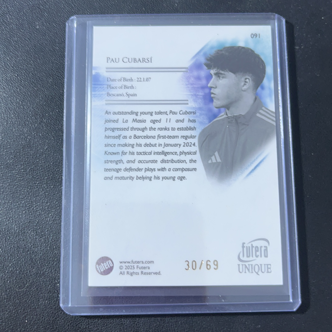 2025 Futera Unique . 【小二哥拆卡】2025 福特拉 Futera 足球 30/69编 西班牙 保·库巴西 Pau Cubarsi 默认瑕疵 收藏必备 猫