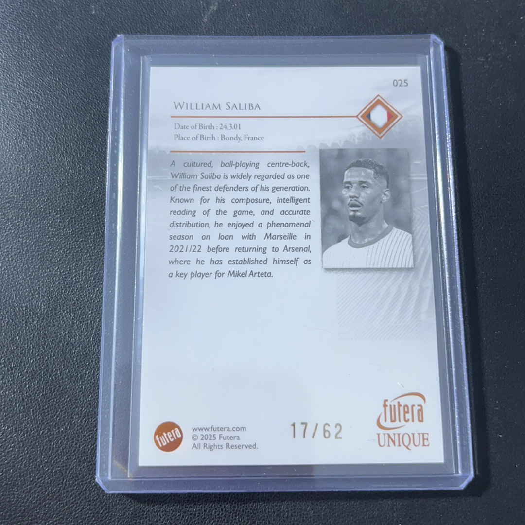 2025 Futera Unique . 【小二哥拆卡】2025 福特拉 Futera 足球 17/62编 法国 威廉·萨利巴 Willam Saliba 默认瑕疵 收藏必备 猫