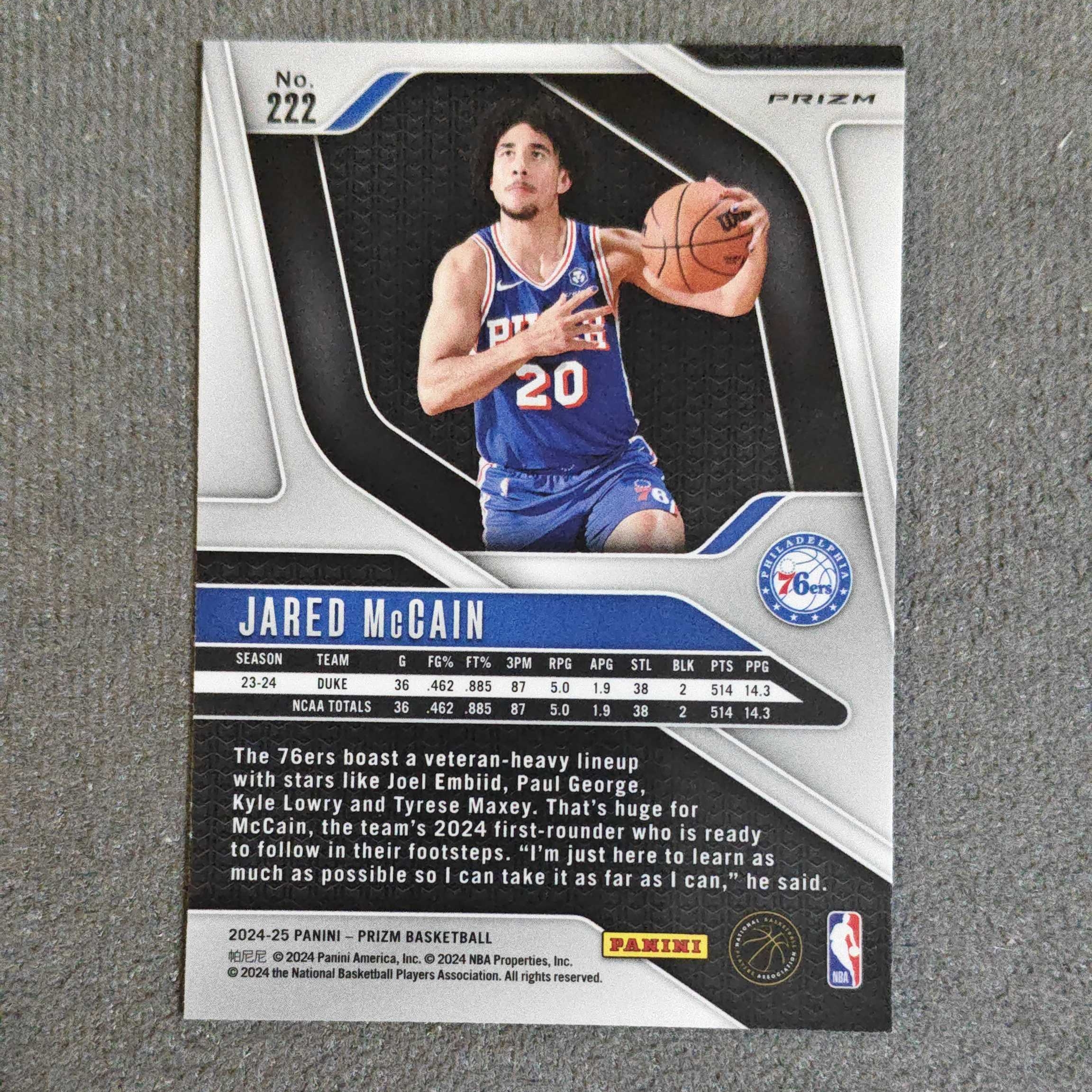 2024-25 Panini Prizm Jared McCain RC PZ系列 新秀RC 贾里德 麦凯恩 正银折射 76人 魔仙哥 未来可期 值得珍藏