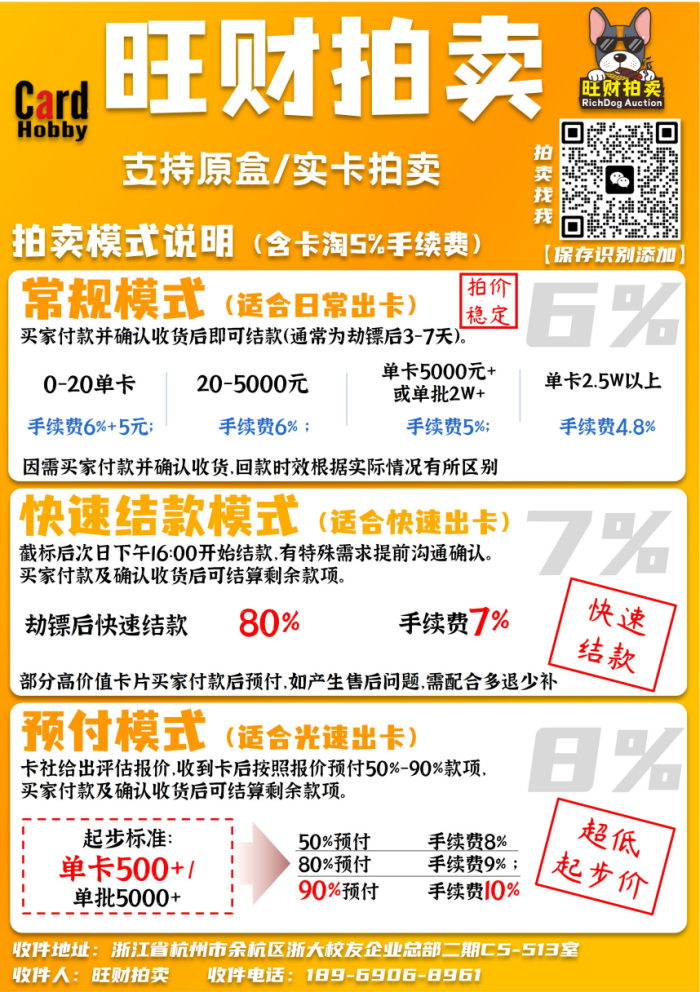 需要代拍、代送评(PSA/BGS/CGC)原箱代订/代拆:请+WangCaicard 【参拍前买家必看,出价即默认了解该规则】 收费说明: 长期接代拍,支持各类卡牌。 0-20元,收取6%+5元上拍费用(含卡淘5%)。 20-5000元7% (含卡淘5%)粉丝群友6%。 单卡5000元以上或单批卡20000以上5%(不收费用) 单卡25000元以上 手续费4.8% 日常回款模式是需买家付款并确认收货,回款时效根据实际情况有所区别,每日下午16:00会统一整理订单付款情况,有不清楚进度的可以联系客服了解;周末不结算 快速回款模式是收到卡就可以做估价和百分比直接回款(比例和估价模式请联系客服详细沟通),结算时我们会提供表格标明付款情况方便核对。 截标后预付模式是截标后次日下午16:00开始结款,有特殊需求提前沟通确认。买家付款及确认收货后可结算剩余款项。 卡品规则说明: 1.所有卡实物拍摄,卡品如图,请仔细看图,裸卡无法确保高评级水准,有明显瑕疵伤害会单独拍照,如果无图片特殊展示瑕疵均为通行卡品。 2.国宝、IMM等系列厚卡的小白边小白角,prizm、optic等系列薄卡的小划痕、小印刷线,镜面卡签有小划痕均属于通行卡品,评级卡砖上的划痕和破损不属于品相问题,关于以上卡品问题请确认无误再出价,如需完美卡品的买家,请买高分评级卡。(不要假装没看规则来扯皮,没有任何意义,玩卡收藏多点真诚少点套路) 拍卖付款规则说明: 3.截标后请于3日内付款,拍卖结束后3天内未付款视为鸽子处理,直接拉黑及投诉封号处理!关闭订单不接受任何理由重新开启,所以请及时付款) 4.关于累计: 不累计!不累计!不累计! 5.对于截标日期接近的卡有兴趣的卡友,可以在拍下后不着急付款,在平台支付时限内集中支付,可以达到类似累计的效果; 6.每日下午4点前支付订单当天发货。4点后支付订单次日发货。 7.每日23:00统一合并订单,我们只合并当天的订单,有多日想拍的卡请统一支付,便于我们集中处理,如有特殊情况,联系微信客服处理。 快递规则说明: 1.卡社默认只发京东快递,江浙沪12元,地区二包含省市自治区区域以外统一收费18元。超过首重每公斤按8元收费(地区二:甘肃省、青海省、宁夏回族自治区、内蒙古。收费22元)。 2.由于到付遇到多次恶意拒收,故不支持到付。默认使用京东快递,打包耗材由京东和卡社共用承担(气泡袋,飞机盒,垫卡,防水袋)京东时效类似顺丰,并且京东丢件或出现意外本卡社会负责协助索赔、跟进、投诉,相当于给客户多一道保险。(不是四通一达的服务水平,一分钱一分服务)如果要求顺丰到付,打包耗材将由顺丰提供文件袋,卡社提供气泡袋,base垫卡打包,陆运快递暴力,默认只发空运,在运输途中丢失或损坏请买家自行联系快递公司索赔但我们会协助买家索赔; 3.关于交换板,标题写只发板子不发码麻烦看清楚,不要私信说发码。不发码、不发码、不发码、重要的事情说三遍,请竞拍者看清楚本说明后再竞拍,竞拍成功默认对本卡社规则无异议,尽请谅解; 4.京东发货统一包装标准:每个气泡袋(加封口贴纸)内含2张定制垫卡+瓦楞纸飞机盒(加封口贴纸)+防水袋。收货后也可以检查是否有被人为拆卸过的痕迹,建议收件时拍摄开箱视频; 5.为避免纠纷只发卡淘默认地址,如需更改收货地址请在付款环节直接输入。着急发货的,可联系客服VX: WangCaicard。价高需要保价请付款后联系客服说明保价要求,未联系说明要求保价的一律默认发出。 6.快递到达后请及时取件,签收后请在48小时内拆包检查卡片并录制拆箱视频,如有售后问题需提供开箱视频,没有开箱视频不接受维权。因平台在快递签收后48小时后会关闭维权按钮,48小时后反馈的问题,将不再受理。 专业团队在卡淘平台专业代卖,粉丝群成员享受6%手续费、快速回款等服务,本店代拍卡享受卡社微信、抖音等多渠道推广引流。 拍卖为代拍,有需要代拍或PSA/BGS/CGC评级可以私信或添加微信:WangCaicard 粉丝群福利多多,欢迎加入~