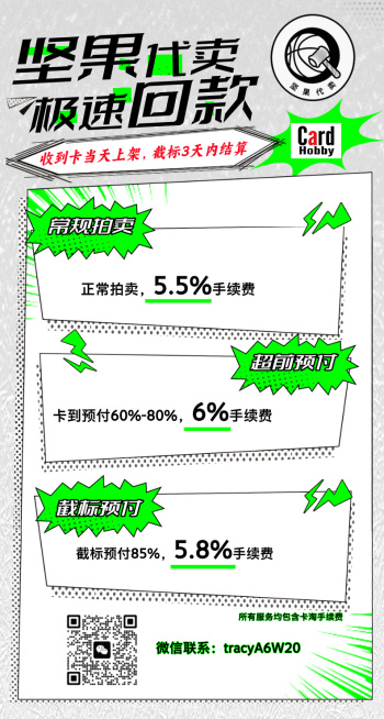 2.参拍:卡品墨迹如图所示(厚卡异形卡等都有正常白边白角,部分系列会有特殊瑕疵),请认真看图后再谨慎出价。不接受任何艺术家买卡,如拍到卡后有任何艺术家行为(包括但不限于在通行卡品里挑瑕疵索要赔偿或退卡等)一律拉黑投诉处理。所卖卡未经描述均为通行品,可能会有细微瑕疵;打包标小卡可能会有不同程度的瑕疵,不保障卡品;评级卡壳和原封砖的磨损不包含在卡品范围内;多张上拍卡品通行的同款卡片随机发货。竞拍前可以私聊要细节图,成交后再以有瑕疵、勿拍等理由退卡的一律拒绝,介意者请勿参拍!参拍即视为已读同意!