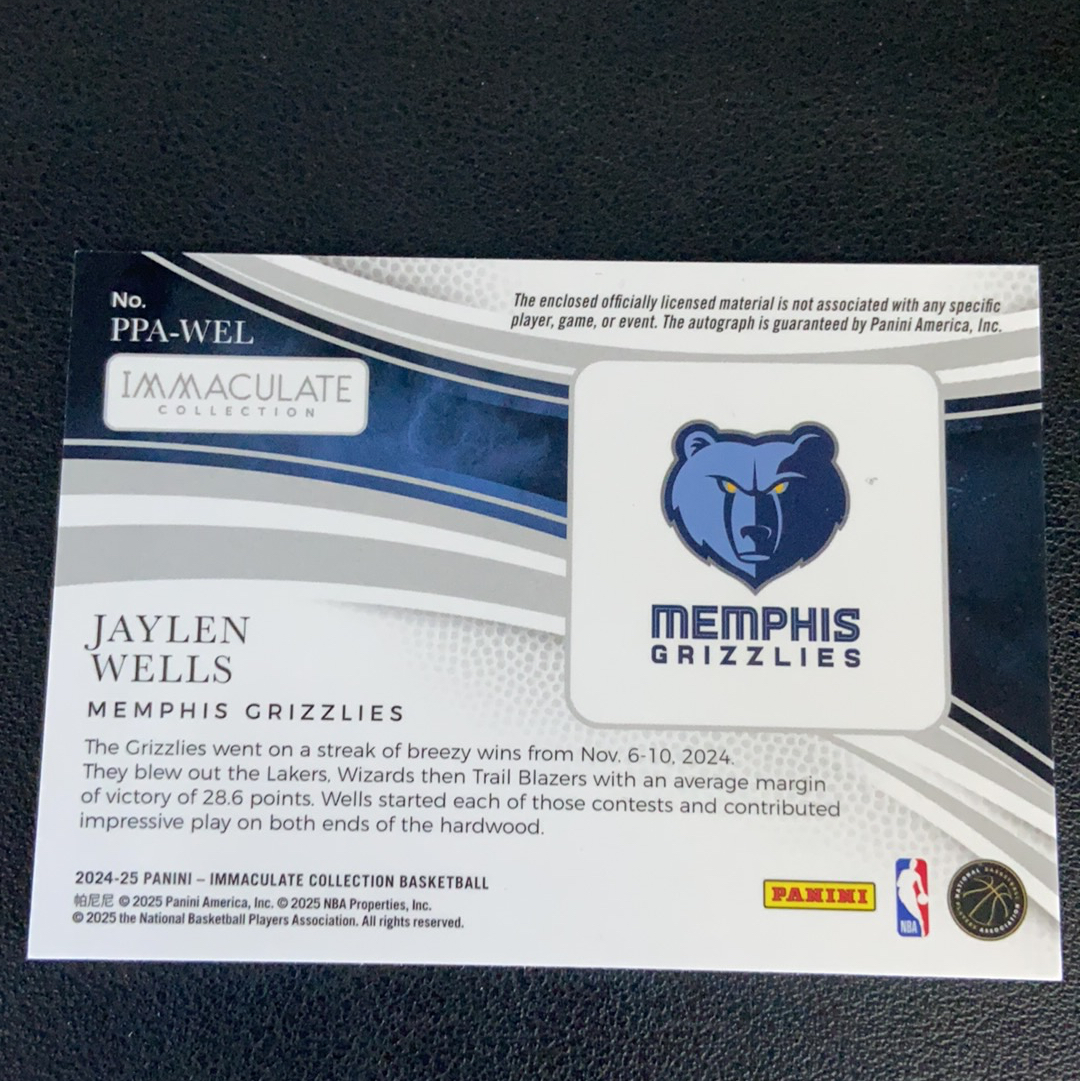 2024-25 Panini Immaculate Jaylen Wells RC 灰熊 新秀 RPA 杰伦 威尔斯 20/50编 大窗 暴力切割 三色patch 球衣物料 签字 卡签 PPA