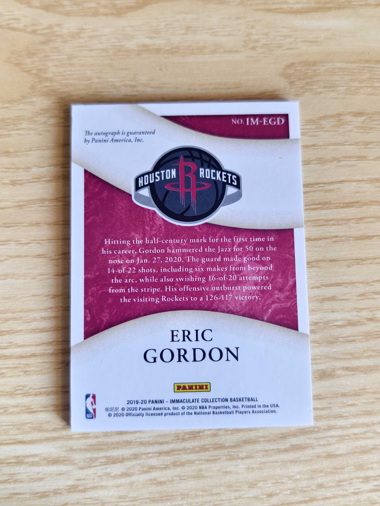 2019-20 Panini Immaculate Collection Eric Gordon 埃里克 戈登 休斯顿火箭队 99编 闪版 签字 签名 卡签 MOMENTS 爱咪咪 50分时刻