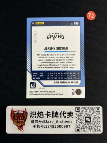 【卡品】一般通行品以上,如无说明则为通行品,艺术家和完美主义者勿扰,请理解通行品的卡品要求(例如国宝,imm,Noir,等系列老卡厚卡轻微小白边白角,镜面卡或薄卡的细微不明显小划痕,Prizm折射系列不明显的印刷线等,评级卡或原封砖外壳上的划痕和磨损以及内壳灰尘,潮湿雾气不属于卡品争议问题范畴内,Lot打包商品均不保证卡品!)单卡如有明显瑕疵会提供文字或照片说明,再有疑问请私信我要细节图,如果不要图出价且拍下则视为接受卡品,恶意维权或退款将会拉黑投诉处理!