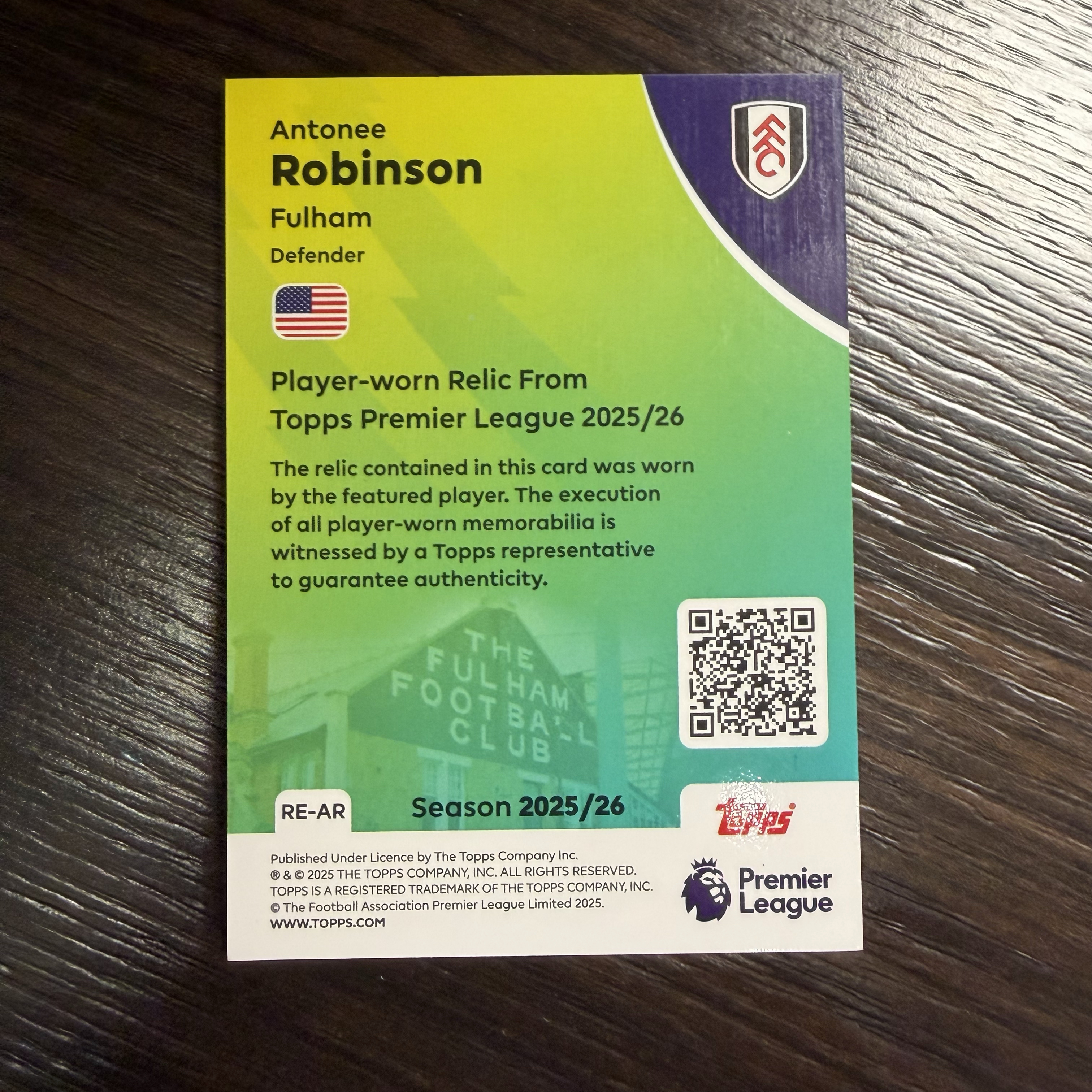 2025-26 Topps Premier League Antonee Robinson 英超 安东尼 罗宾逊 美国 富勒姆 球衣物料 【默认微瑕一日一快递 不累计 不发到付】王🫅