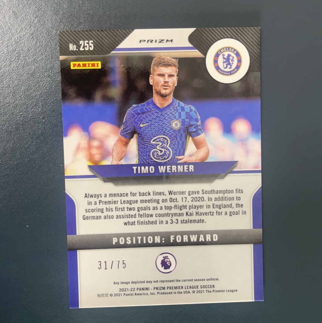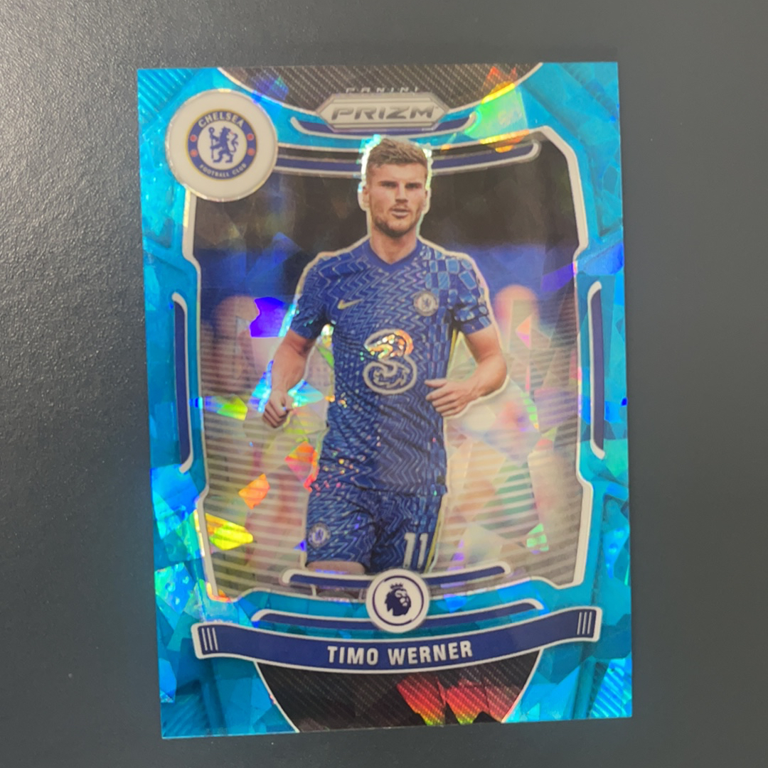 2021-22 Panini Prizm Timo Werner 英超PZ 切尔西 蒂莫 维尔纳 31/75编 蓝碎冰折 折射 收藏必备 品相见图