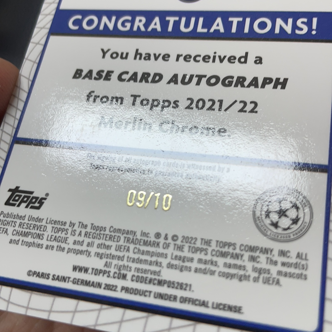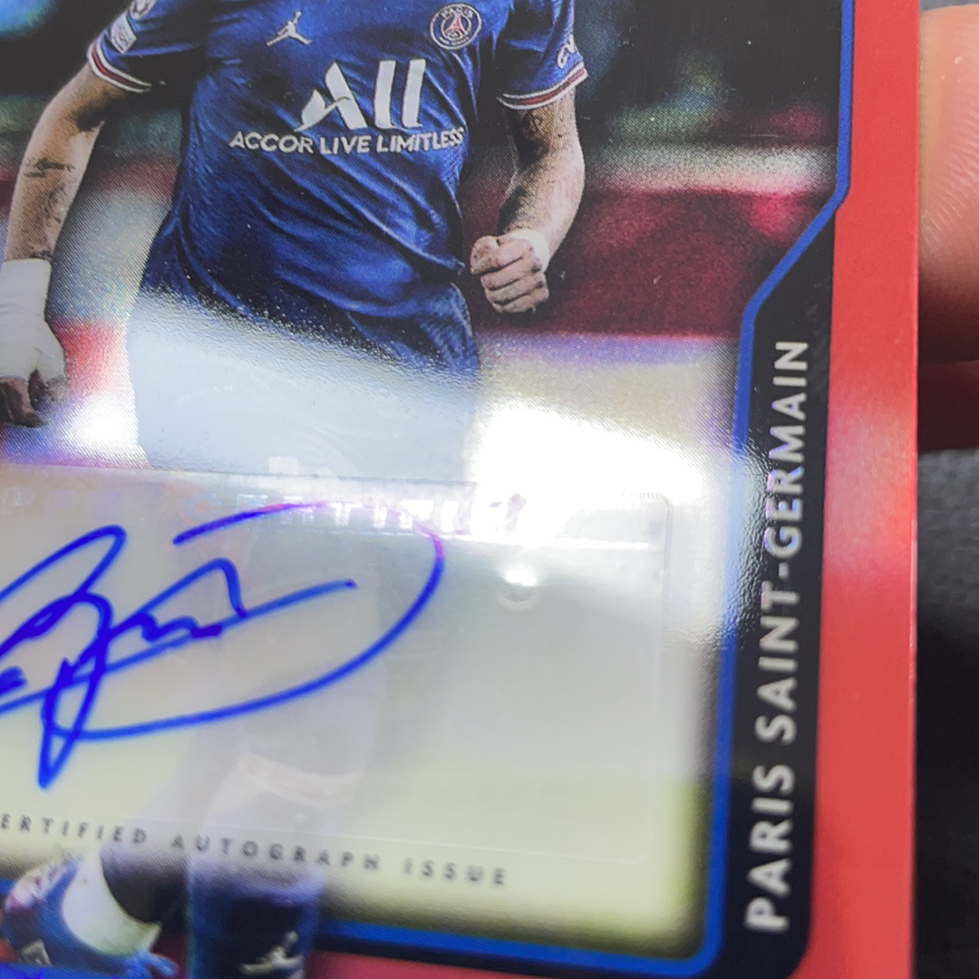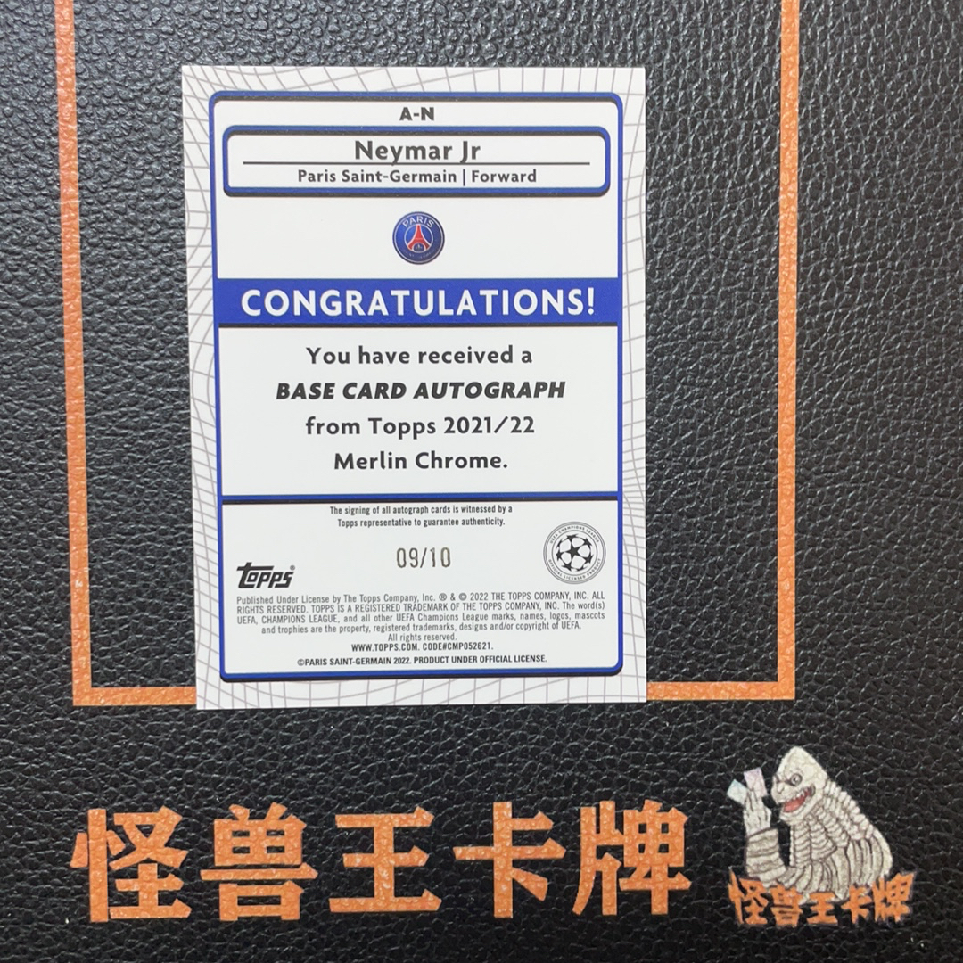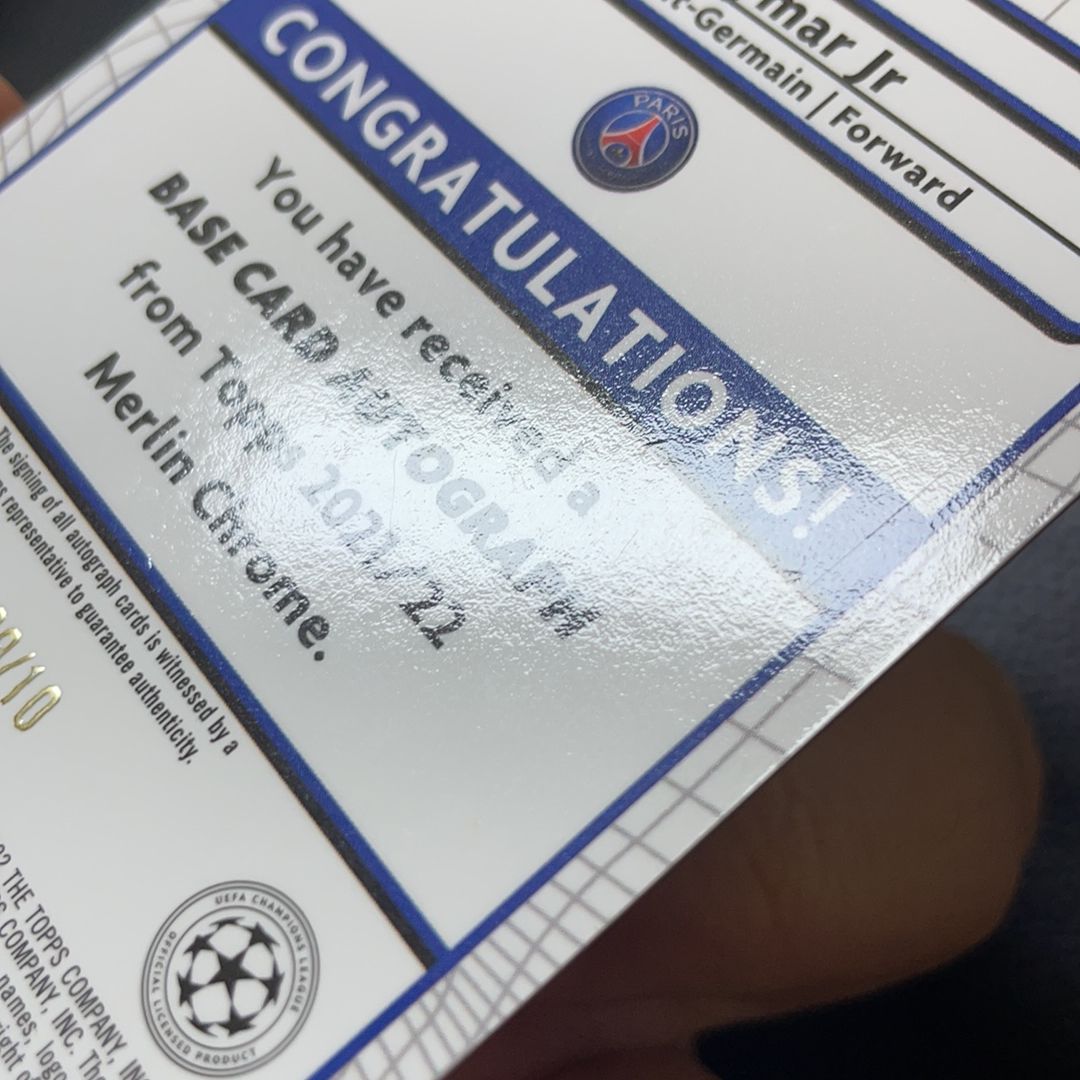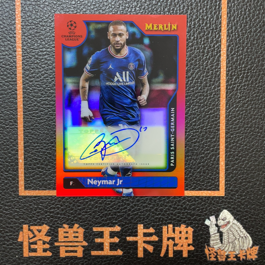 (怪兽拍卖) GSW-G01 2022 Topps Merlin Neymar Jr. 内马尔 巴黎圣日耳曼 巴萨 巴西 梅林 欧冠 红折签 背号签 9/10编 低编 图三贴签鼓包 图四五微小划痕