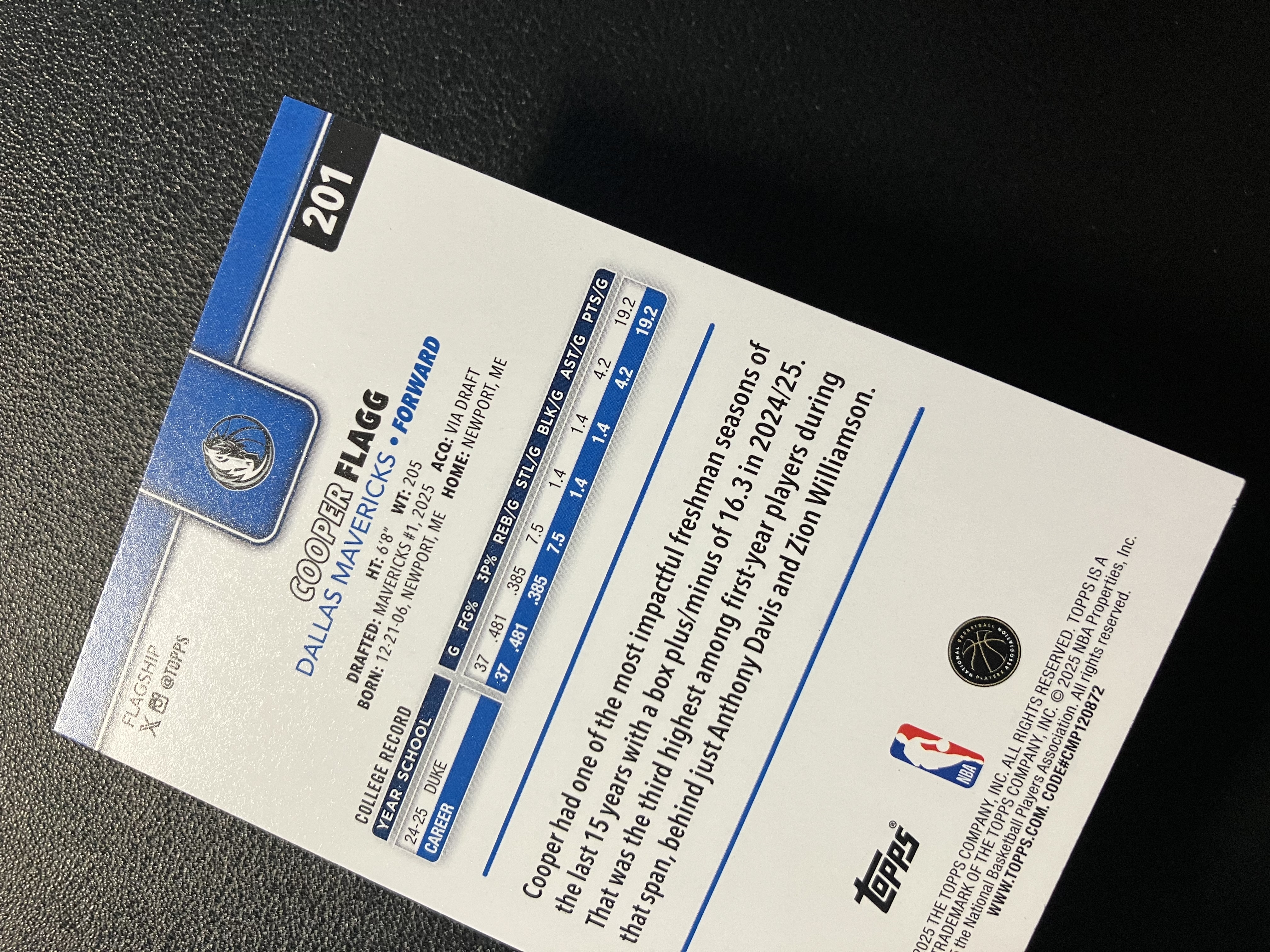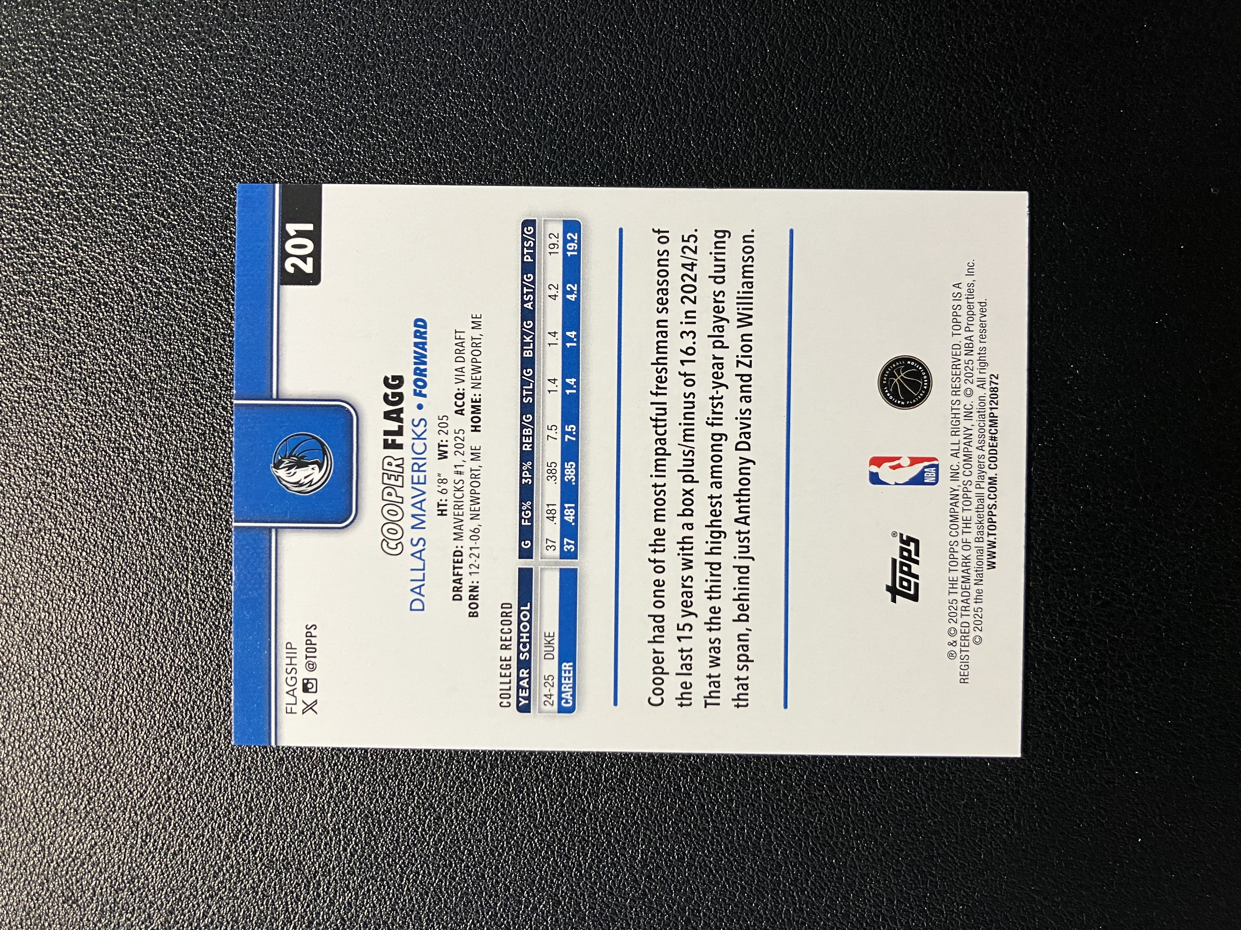 2025 Topps Flagship Basketball Cooper Flagg RC 元年 库珀-弗拉格 正Base RC新秀 独行侠 状元 卡品如图 A003