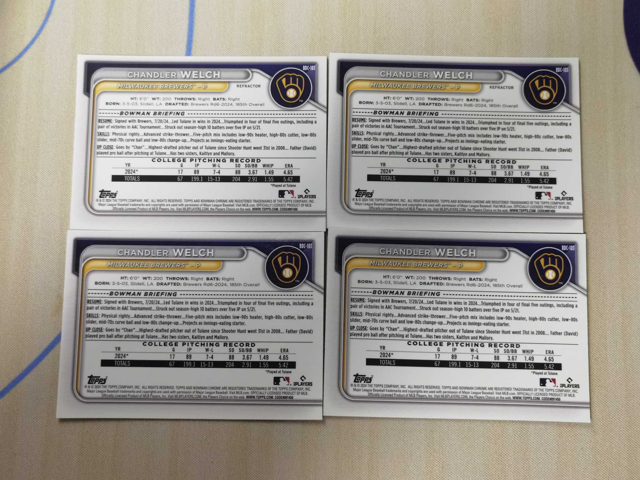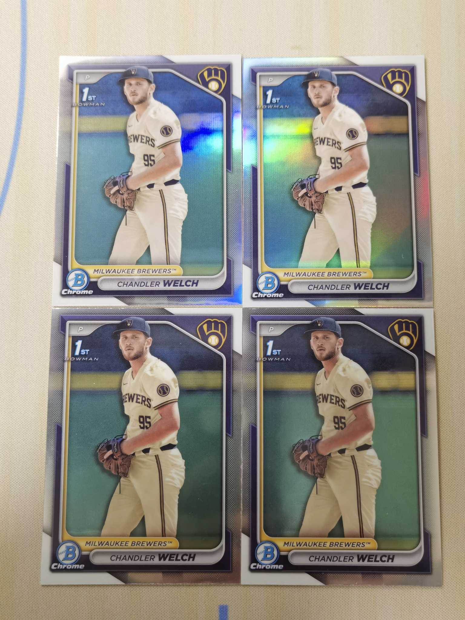 2024 Bowman Chrome Chandler Welch RC 钱德勒 韦尔奇!酿酒人大热新秀捕手,农场大雾!新秀年1st正银折+base 4张lot!eBay价高,可搏psa高分!长期看涨!