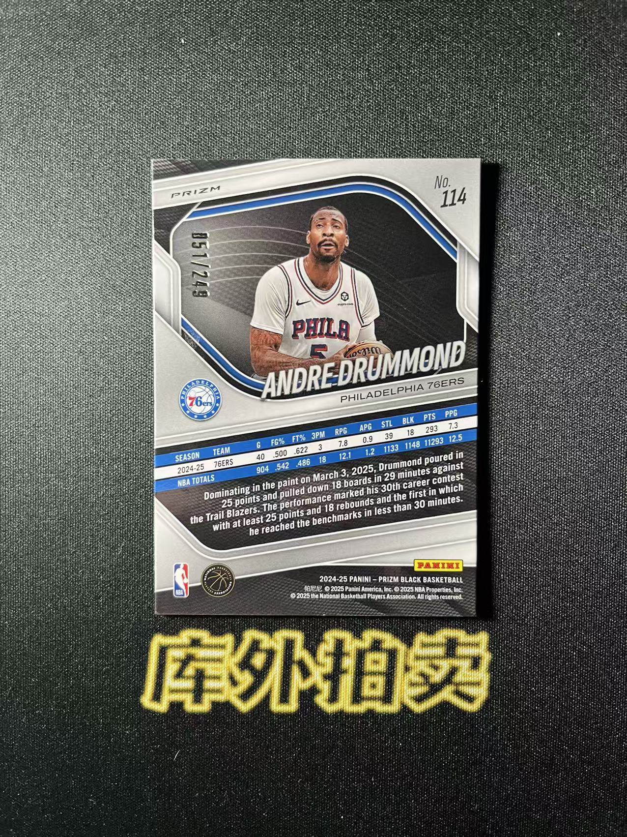 2024-25 Panini Prizm Andre Drummond 76人 安德烈 德拉蒙德 庄神 Prizm Black系列 249编 瀑布折 带编 卡品如图 未来可期 Gn