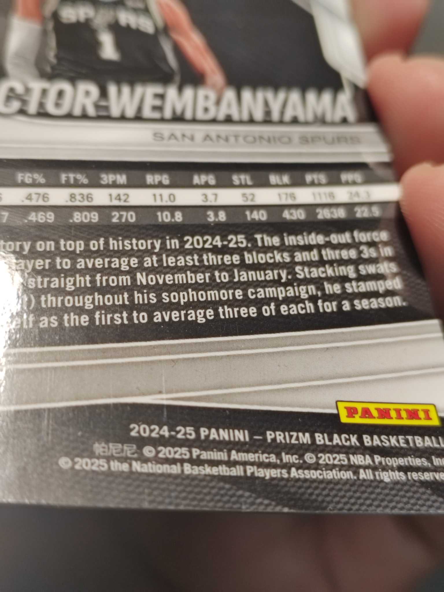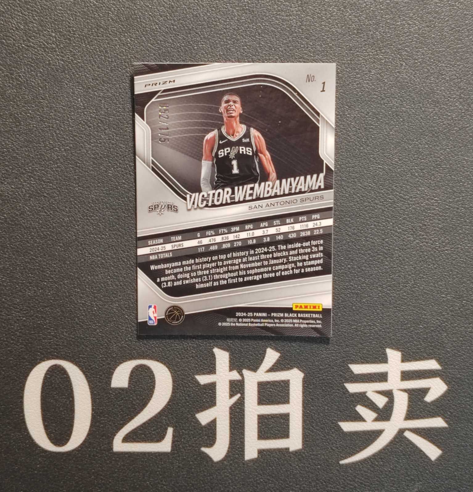2024-25 Panini Prizm Black Victor Wembanyama 新秀次年 维克托 文班亚马 052/175编 白折 马刺 外星人 最佳新秀 怒吼选图 未来门面 微瑕如图 阿硕