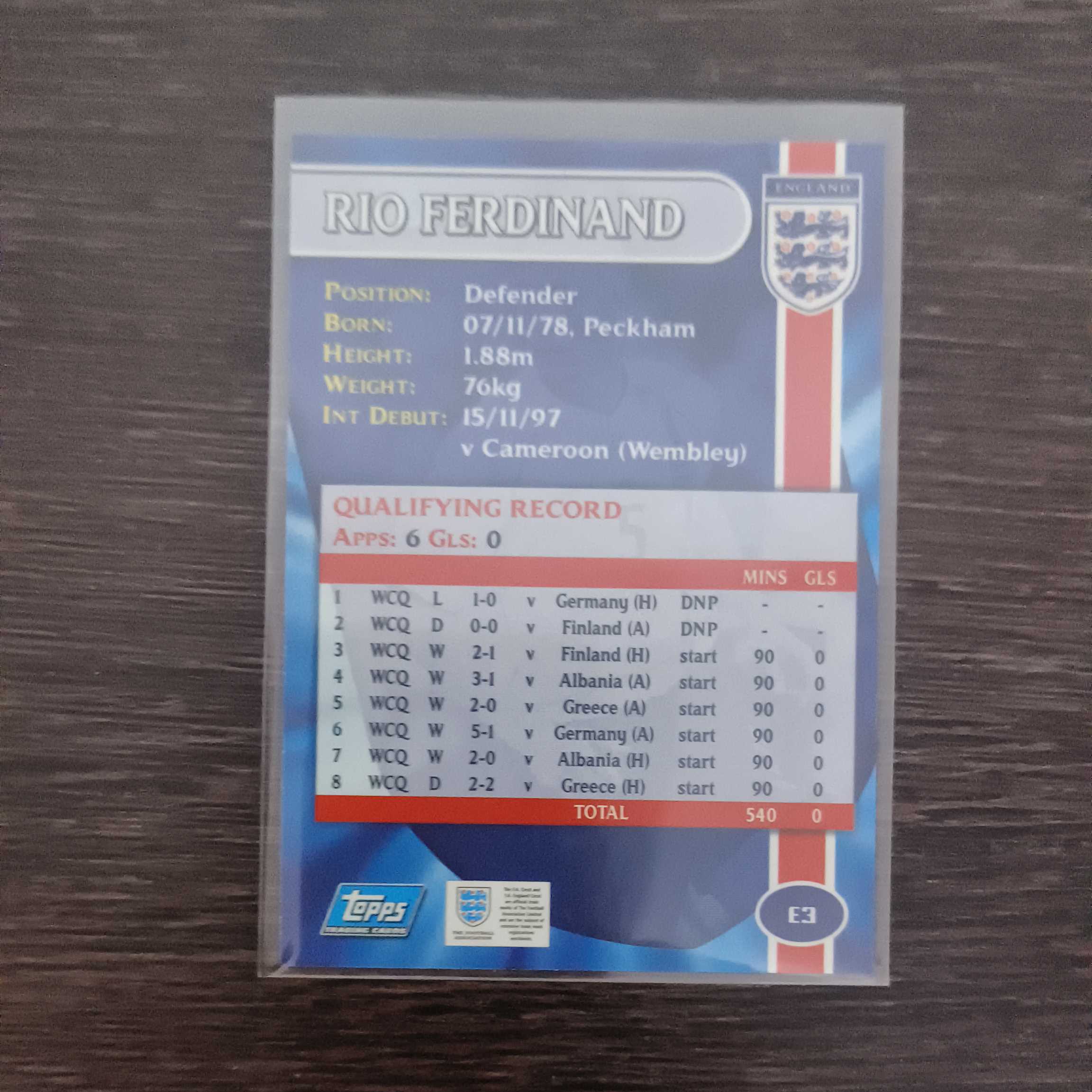 【标准版代拍预付80%】 2002 Topps England 韩日世界杯 英格兰队盒 RIO FERDINAND 里奥 费迪南德 曼联 英格兰背景选图 超美蓝色反光折射闪卡 三狮军团队徽背景 黑人
