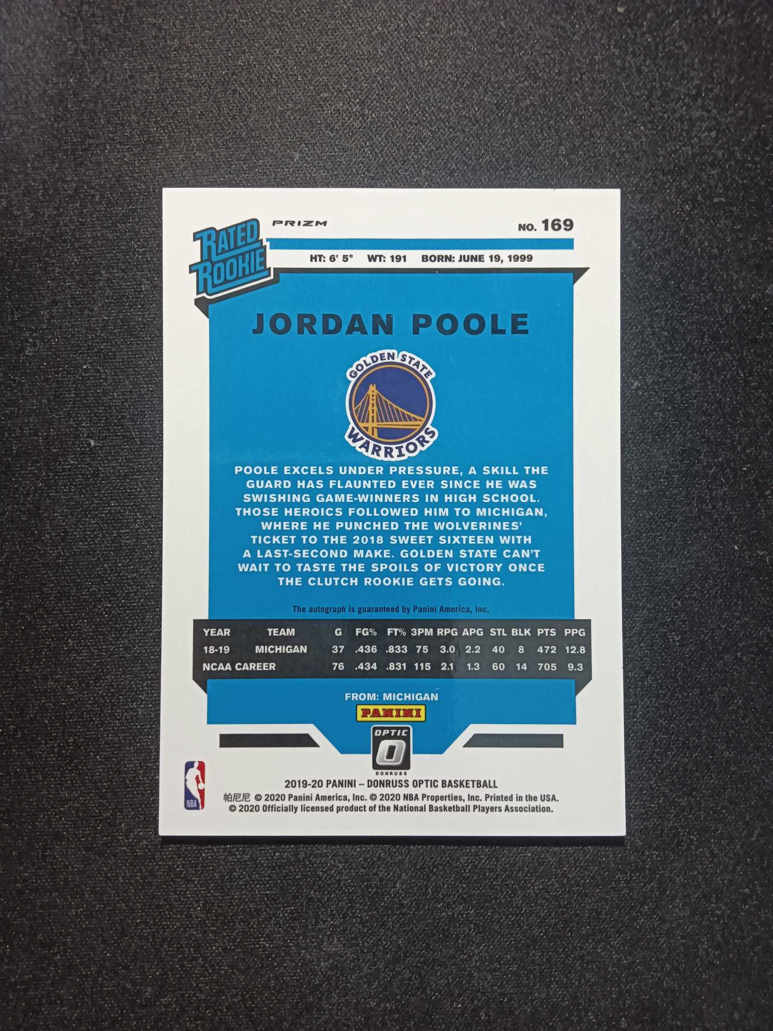 2019-20 Panini Optic Jordan Poole RC 杜蕾斯 OP 勇士 乔丹 普尔 普洱茶 新秀 签字 卡签 紫折 折射 墨迹完美 锡安特雷墨菲费尔斯霍金斯队友 卡品如图 收藏必备