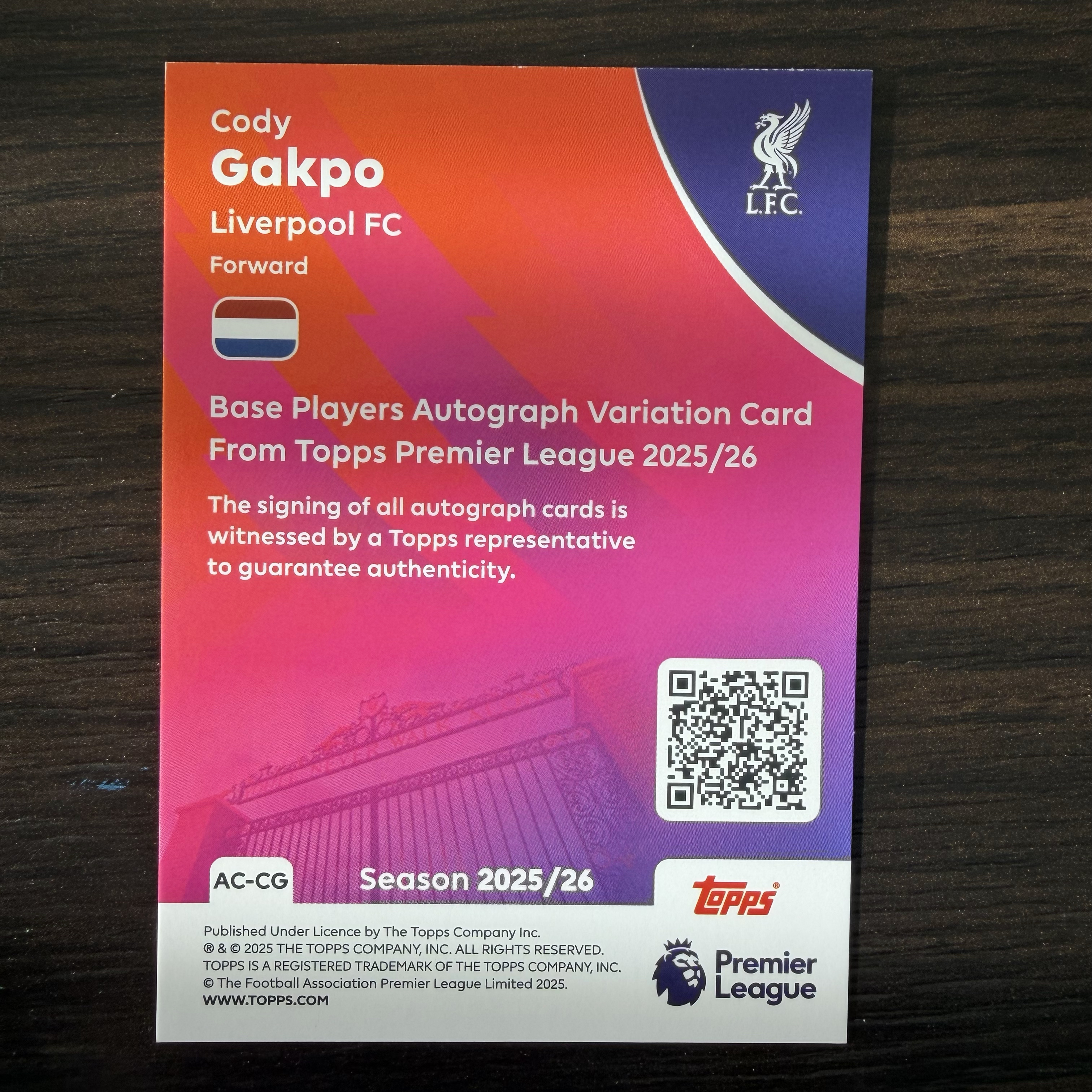 2025 Topps PREMIER LEAGUE Cody Gakpo 英超 加克波 利物浦 银折 签字 【默认微瑕一日一快递 不累计 不发到付】王哥