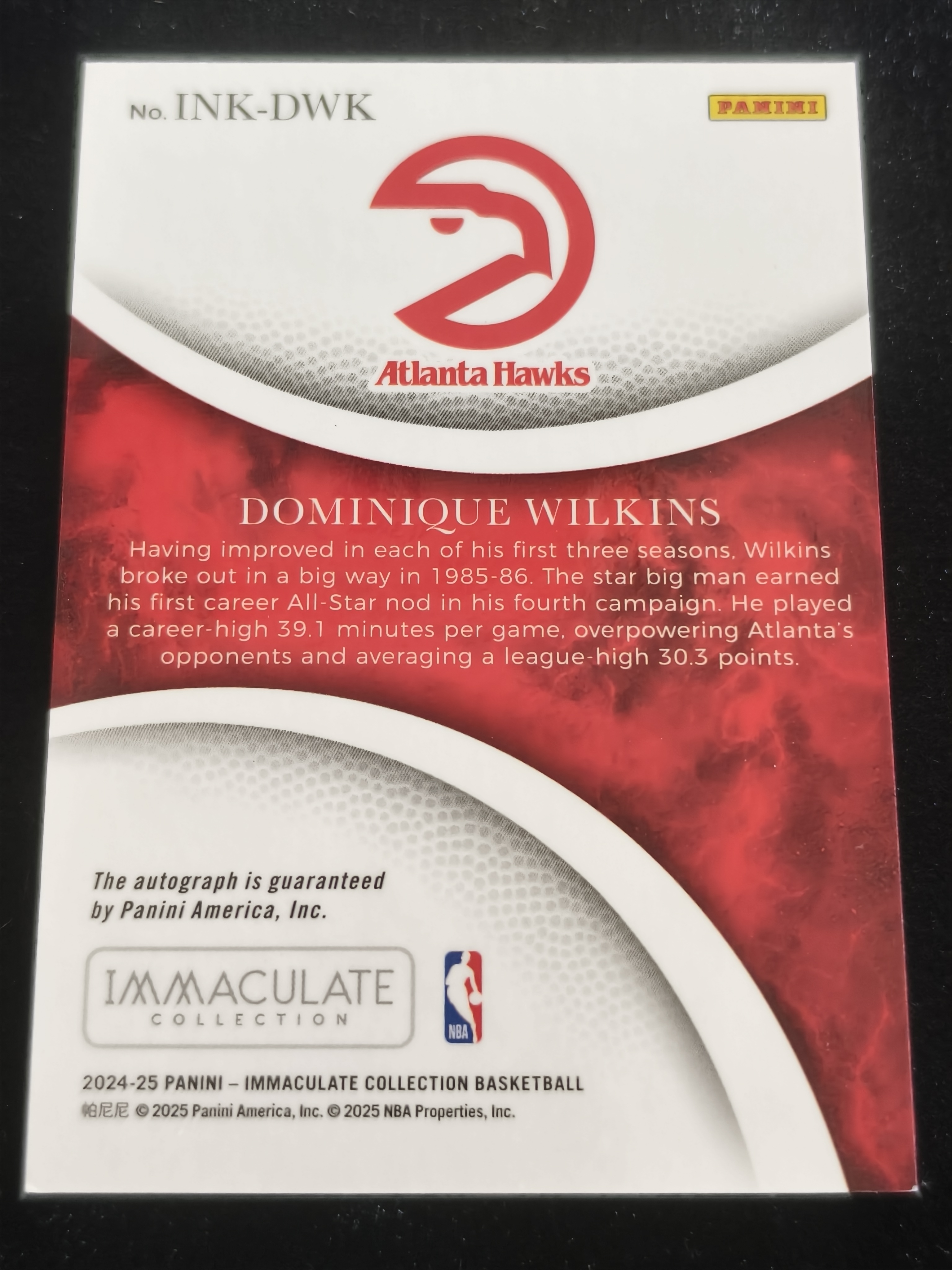 2024-25 Panini Immaculate Dominique Wilkins 多米尼克威尔金斯 老鹰 爱咪咪 41/49编 签字 卡签 Ink签 红平行 看涨 机长代拍 zhq