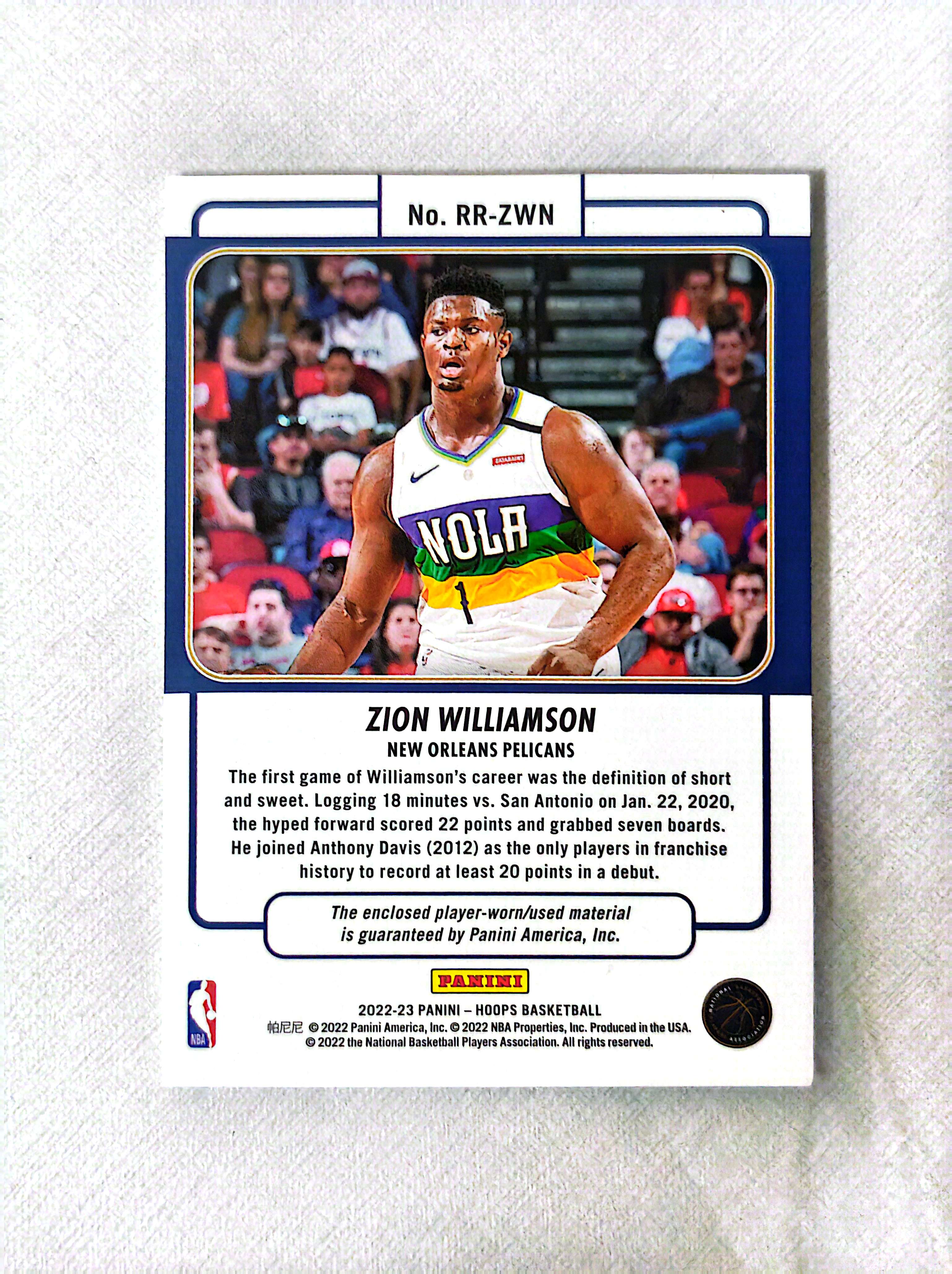 2022-23 Panini NBA Hoops Zion Williamson 鹈鹕队 潜力新星 锡安 球衣卡 衣料卡 物料卡 卡面镶嵌比赛亲穿球衣 莫兰特同届 收藏不可错过