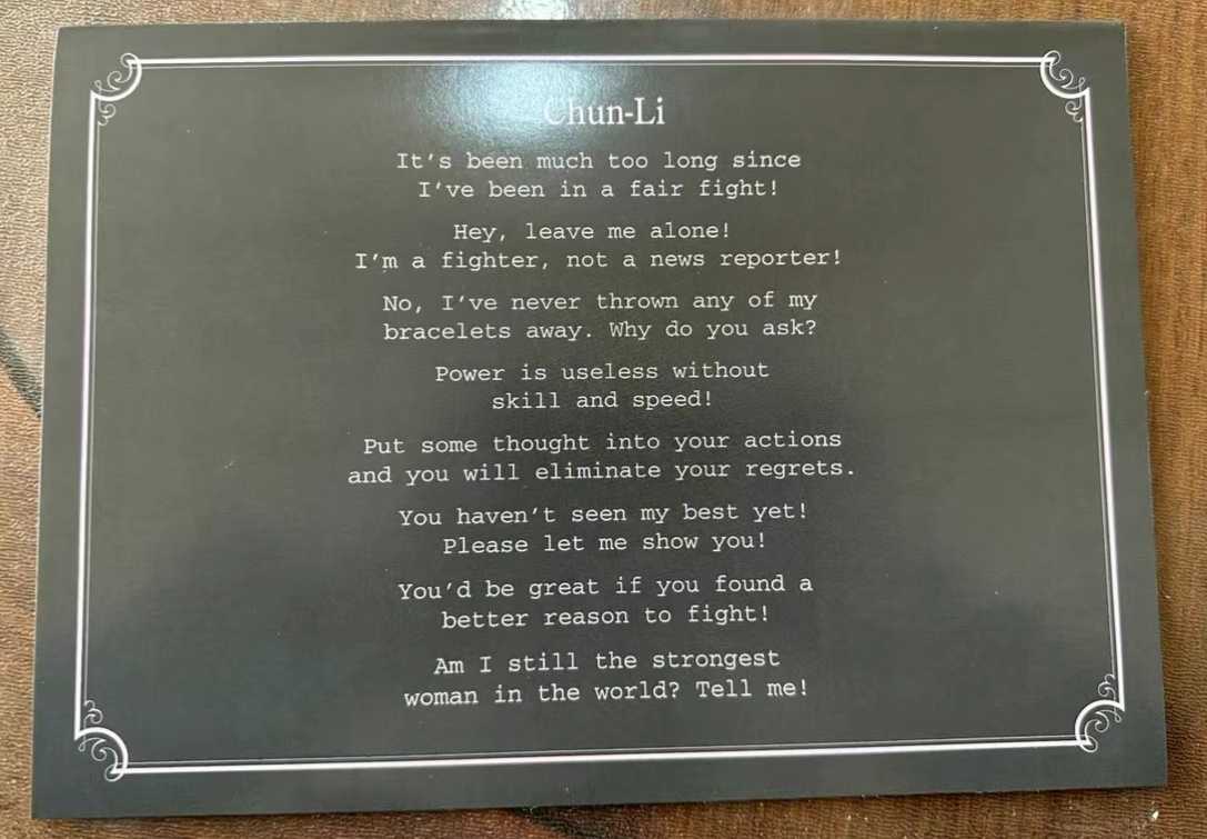 30年前老物件 保真保老 Capcom官方出品的质感绝了,邮票上春丽的不同造型又飒又美,还有大幅艺术插画,细节拉满!背面的介绍文案也很用心,把春丽的格斗精神狠狠拿捏~ 作为街霸系列的元老级女神,春丽不仅是格斗界的Icon,更是无数玩家的青春记忆。这套邮票把她的魅力定格在方寸之间,收藏价值拉满,街霸迷们真的可以冲!