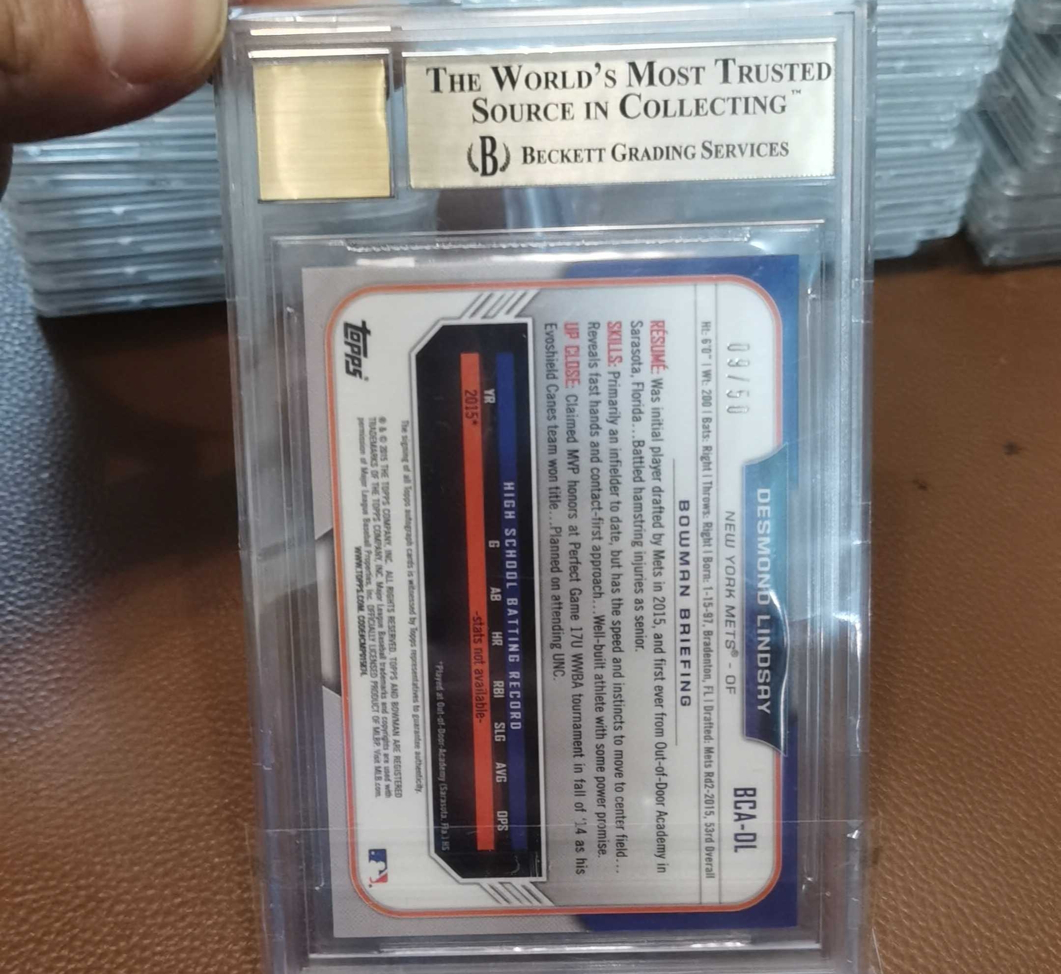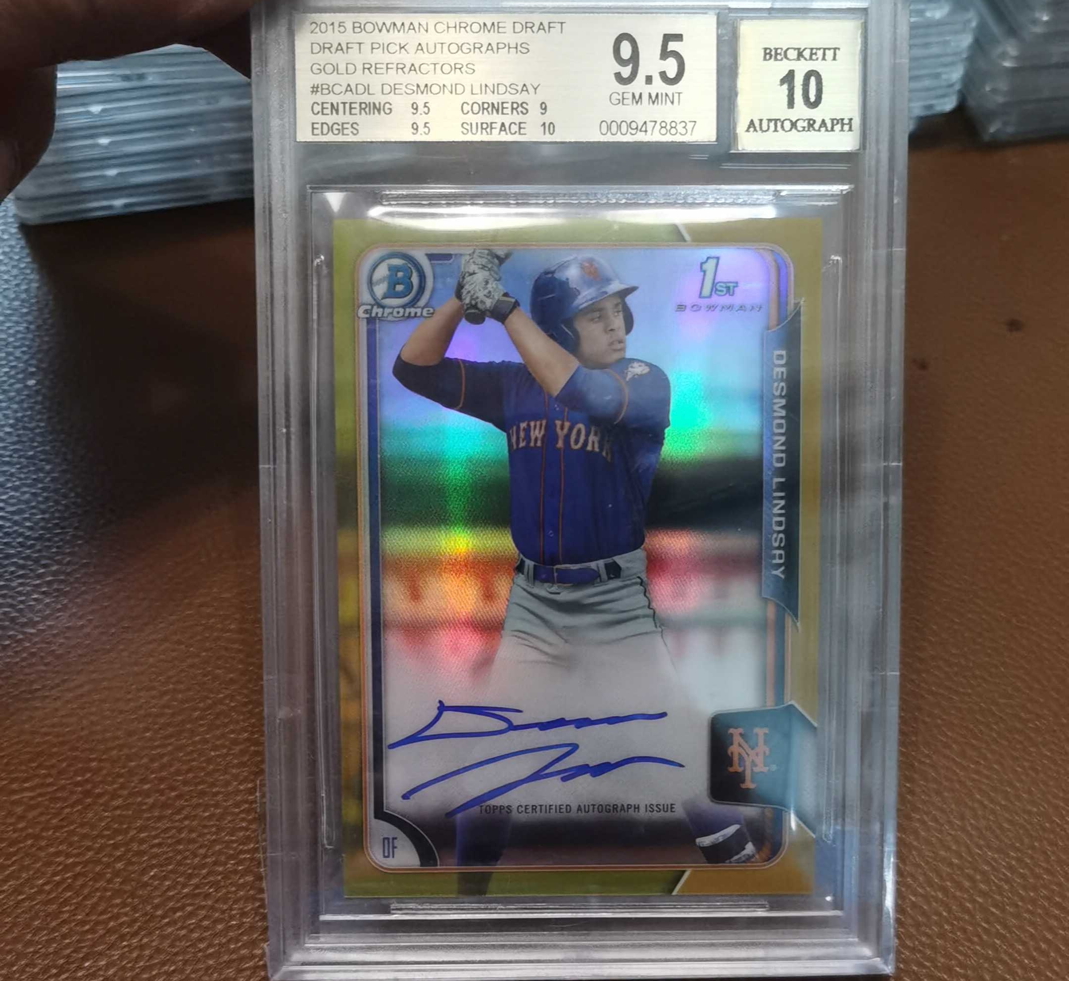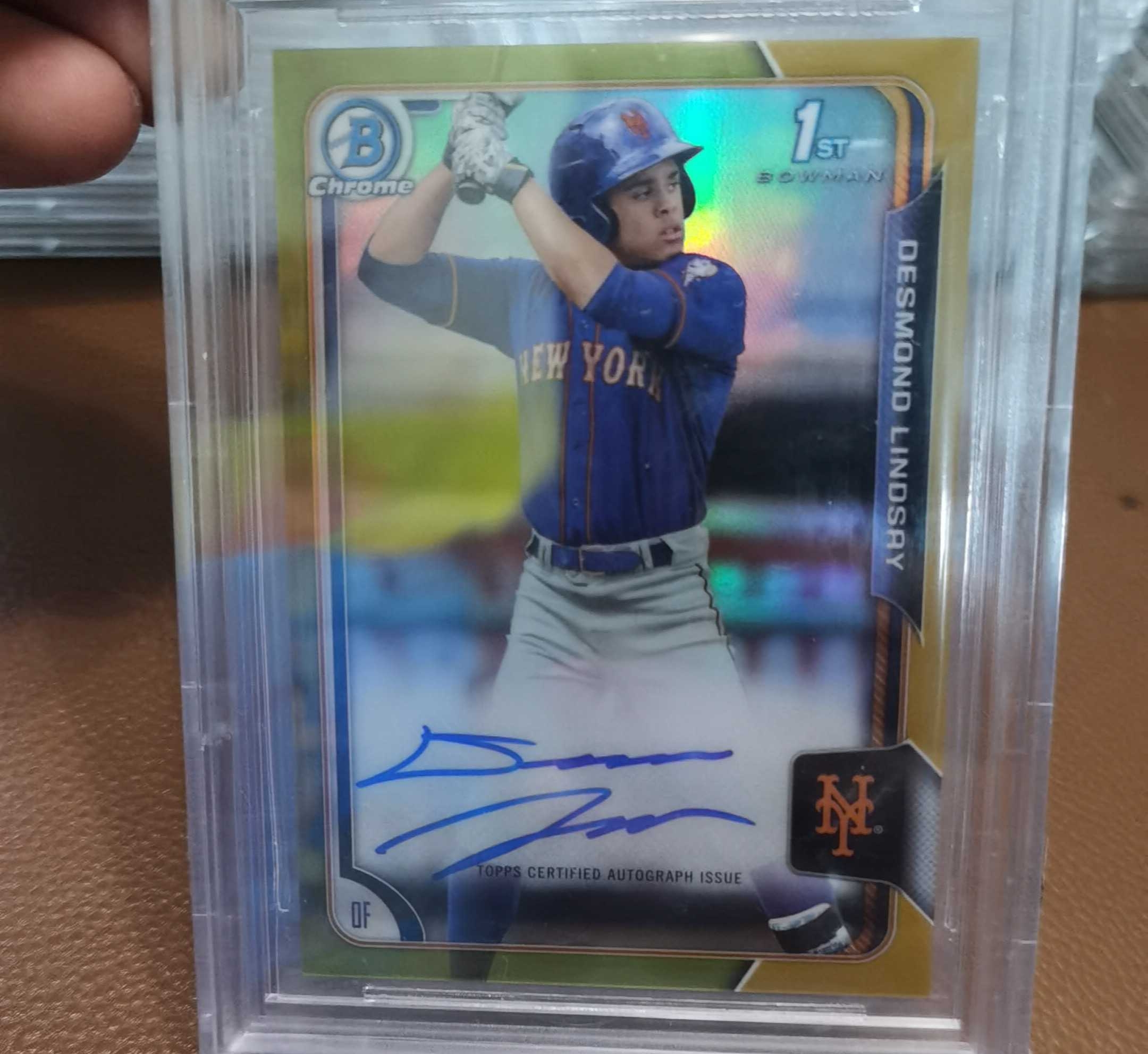 2015 Topps BOWMAN CHROME DESMOND LINDSAY RC 1st新秀签字正金折50编 BGS9.5/10分 完美品相 大都会击球手挥棒选图 关键RC 收藏佳品 实卡超美