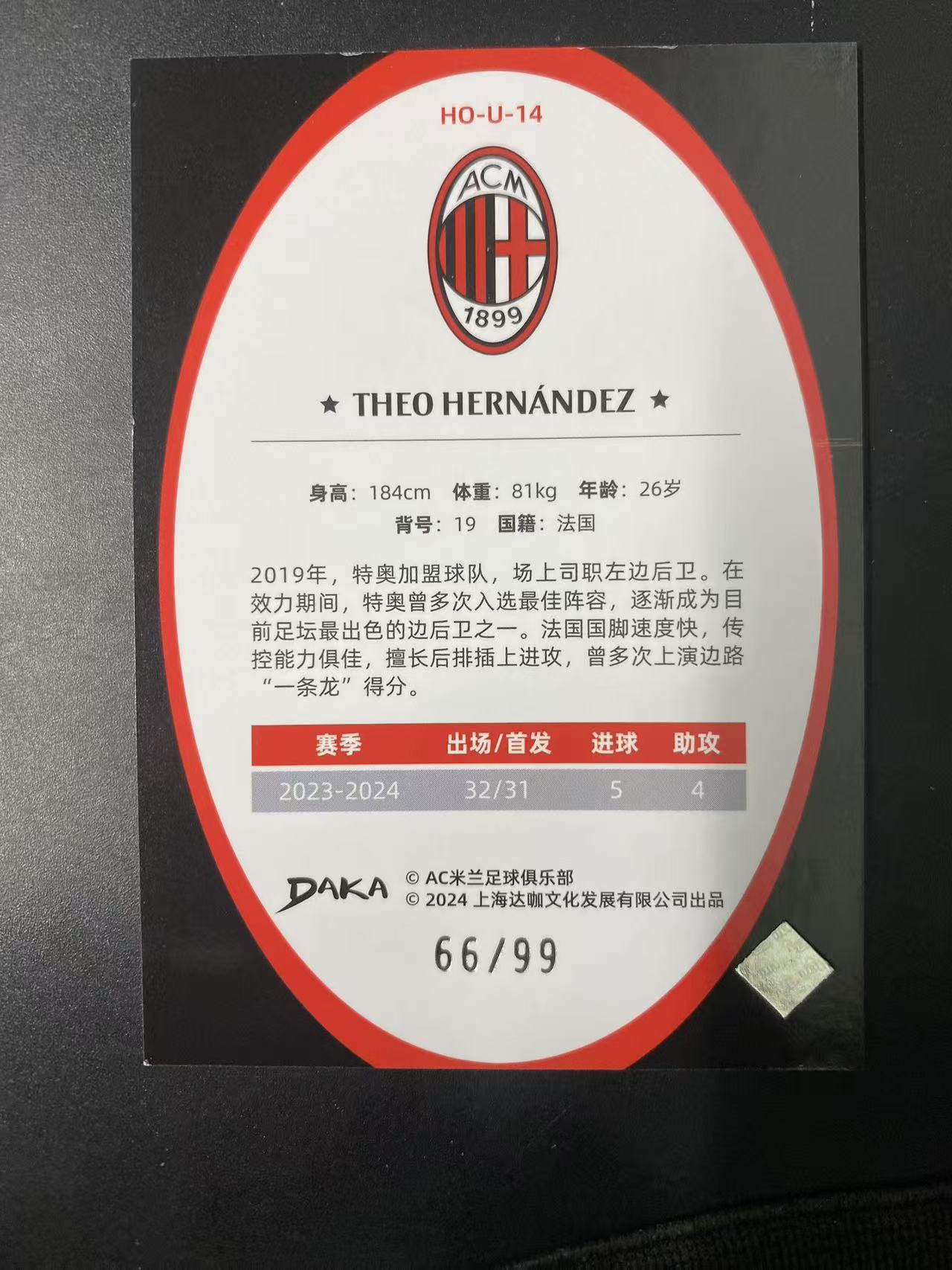 2024 DAKA 米兰队盒 Theo Hernández 特奥 埃尔南德斯 AC米兰 特卡 66/99编 卡品如图 微瑕 睡总
