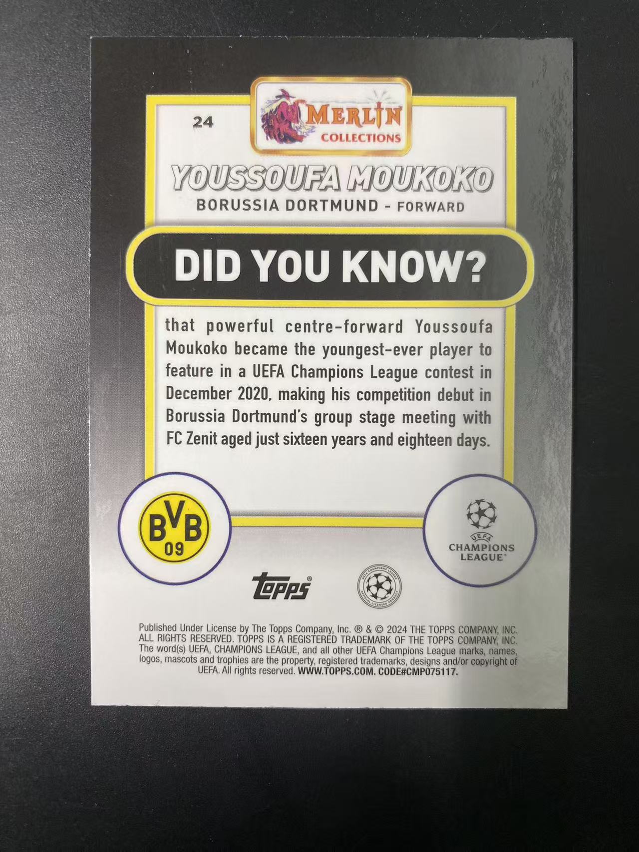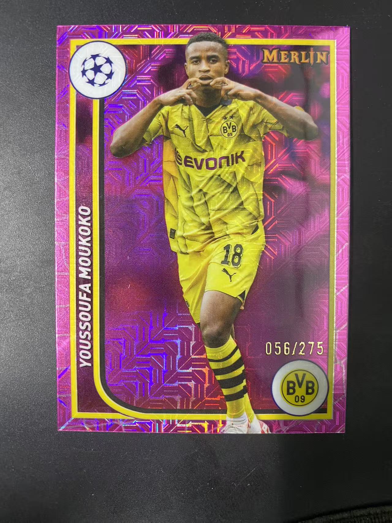 2024 Topps Merlin chrome Youssoufa Moukoko 梅林 欧冠 穆科科 56/275编 粉mojo折 多特蒙德 根本哈根 德国 维尔茨队友 卡品如图 微瑕 睡总