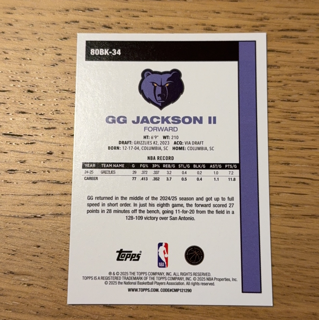 2025-26 Topps Basketball G.G. Jackson 回归NBA第一款系列 孟菲斯灰熊 GG杰克逊45周年银折 20251026006