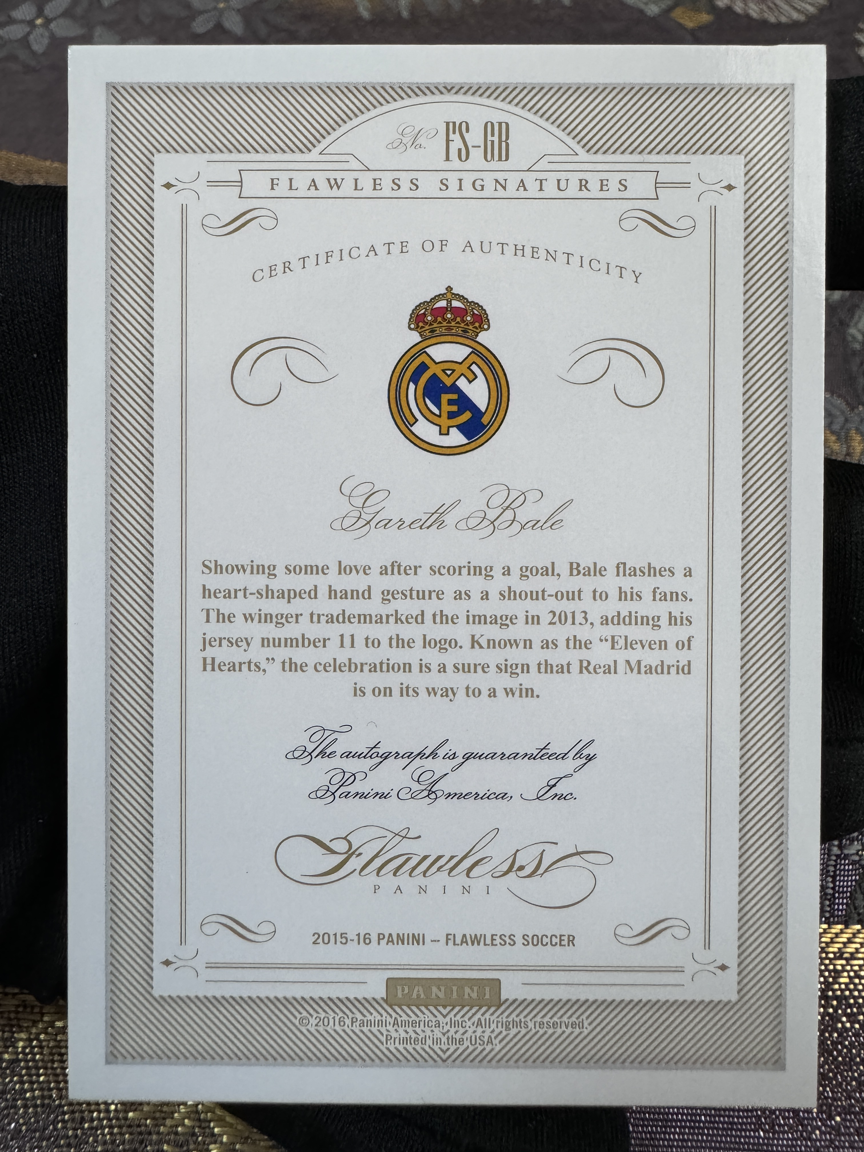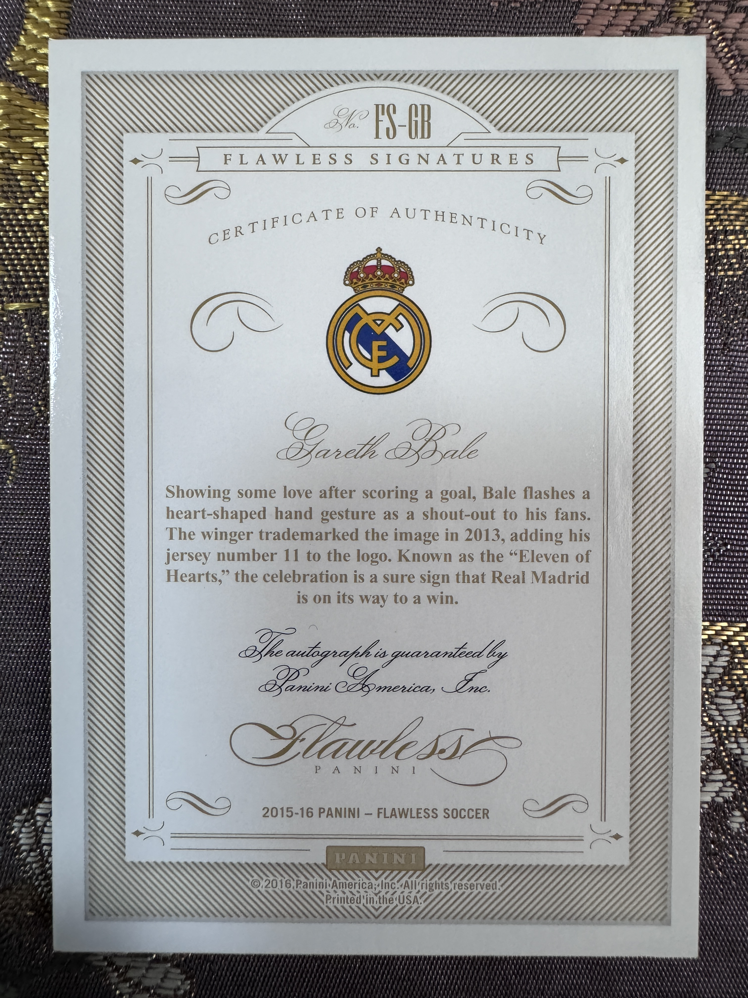2016 Panini Flawless Gareth Bale 足球殿堂 手提 皇家马德里 腾云驾雾的大圣 加雷斯 贝尔 欧冠之王 金闪版 卡签 18/25编 签字 老卡 稀有 完美墨迹 实卡精美