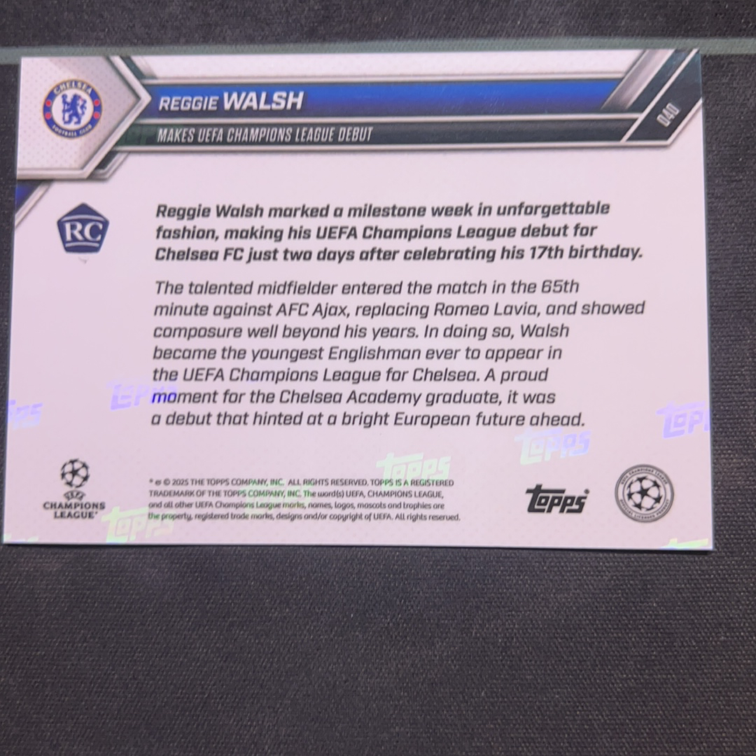 2024-25 Topps Now Reggie walsh RC 切尔西 雷吉 沃尔什 英超 英格兰前锋 新秀 rc 欧冠 欧协联 欧冠首秀的年轻球员 实卡精美 收藏凑套必备 屁屁卡卡