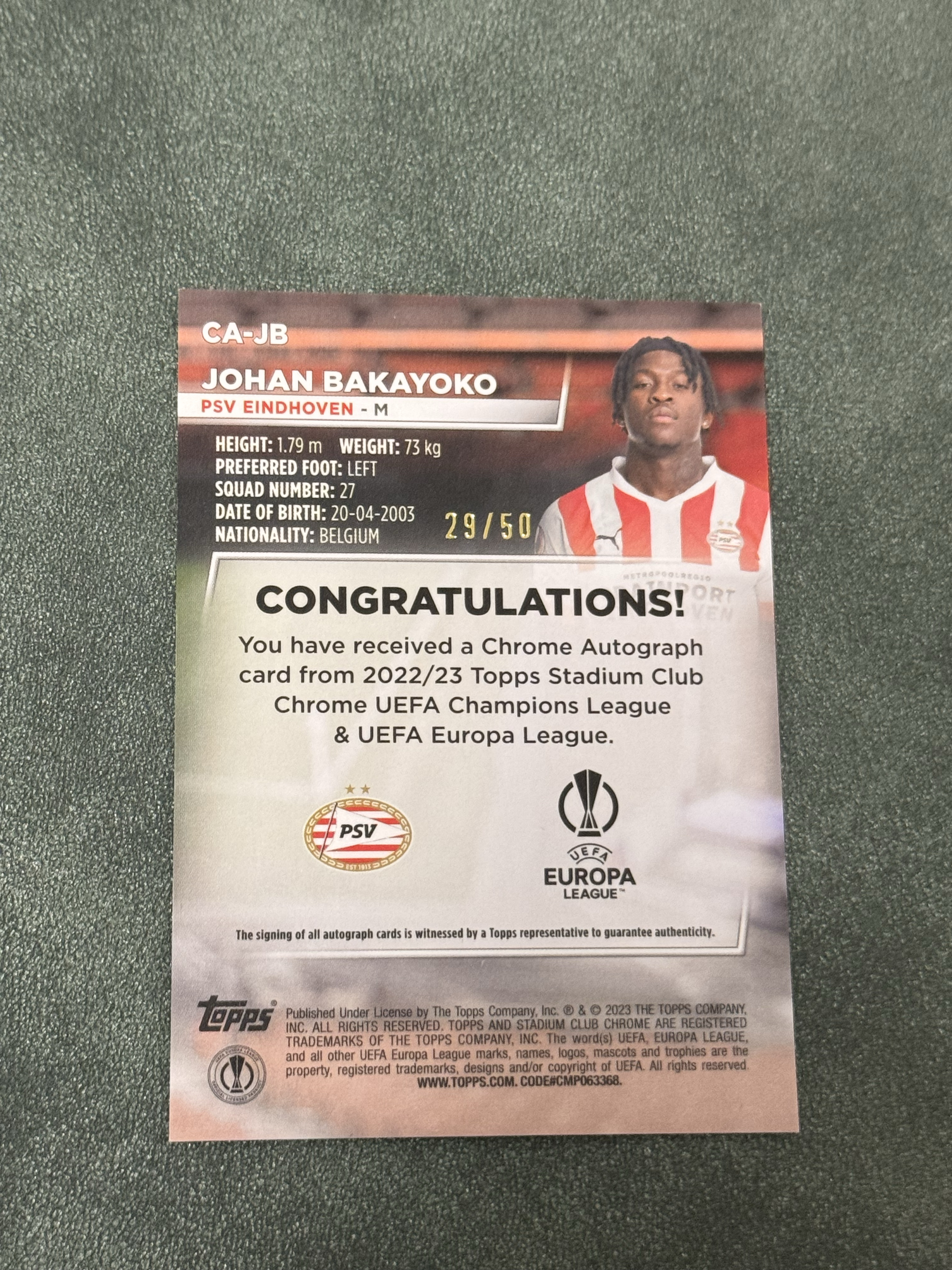 2023 topps stadium club 欧冠竞技场 Johan Bakayoko 莱比锡 巴卡约科 埃因霍温 欧联 RC新秀 签字 50编 金折 实卡精美 收藏必备