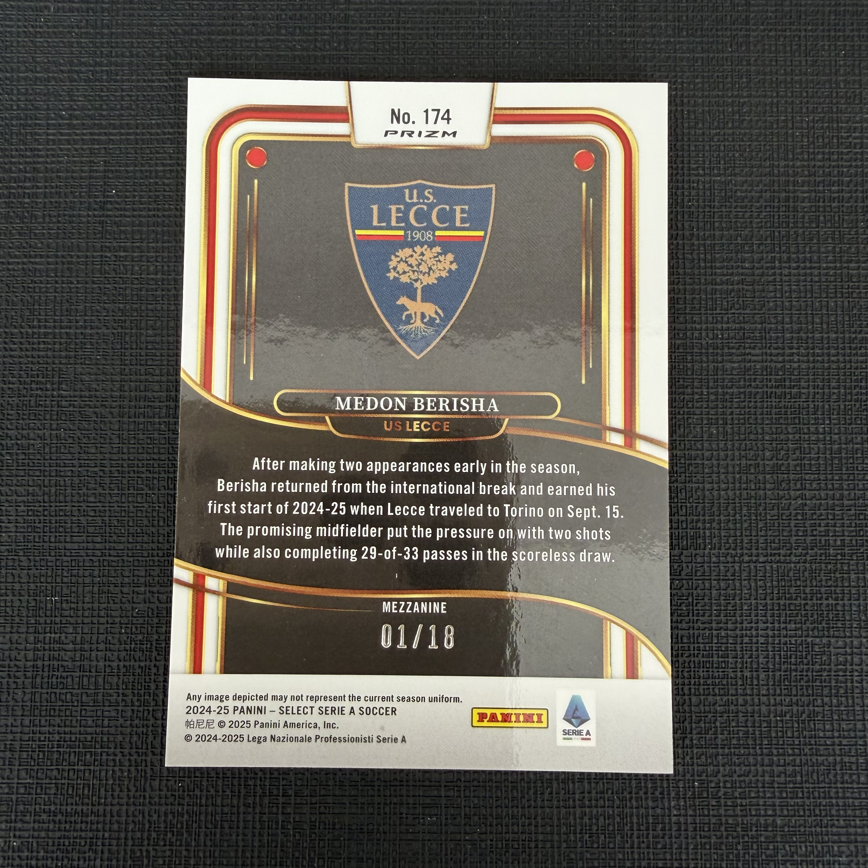2024-25 Panini Select Serie A Medon Berisha 意甲 SELECT 莱切 梅冬 贝里沙 龙鳞折 01/18编 首编 超低编 大比例 【默认微瑕 不发到付】卡ss