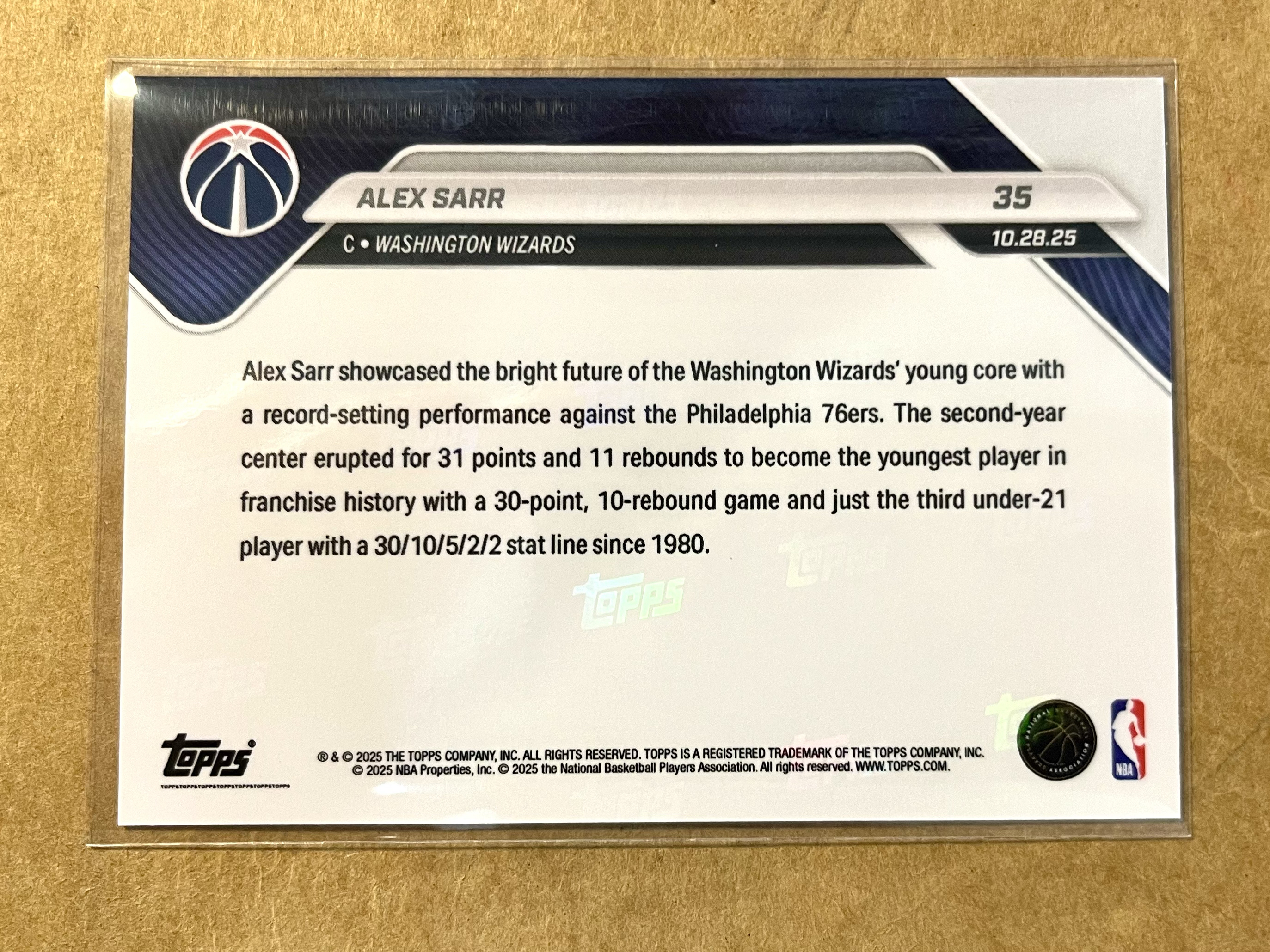 2025 Topps 【蓝矿】 Alex Sarr 亚历克斯·萨尔 Topps now系列 2025NBA常规赛 奇才 球队历史单场比赛达到30分10篮板最年轻球员!