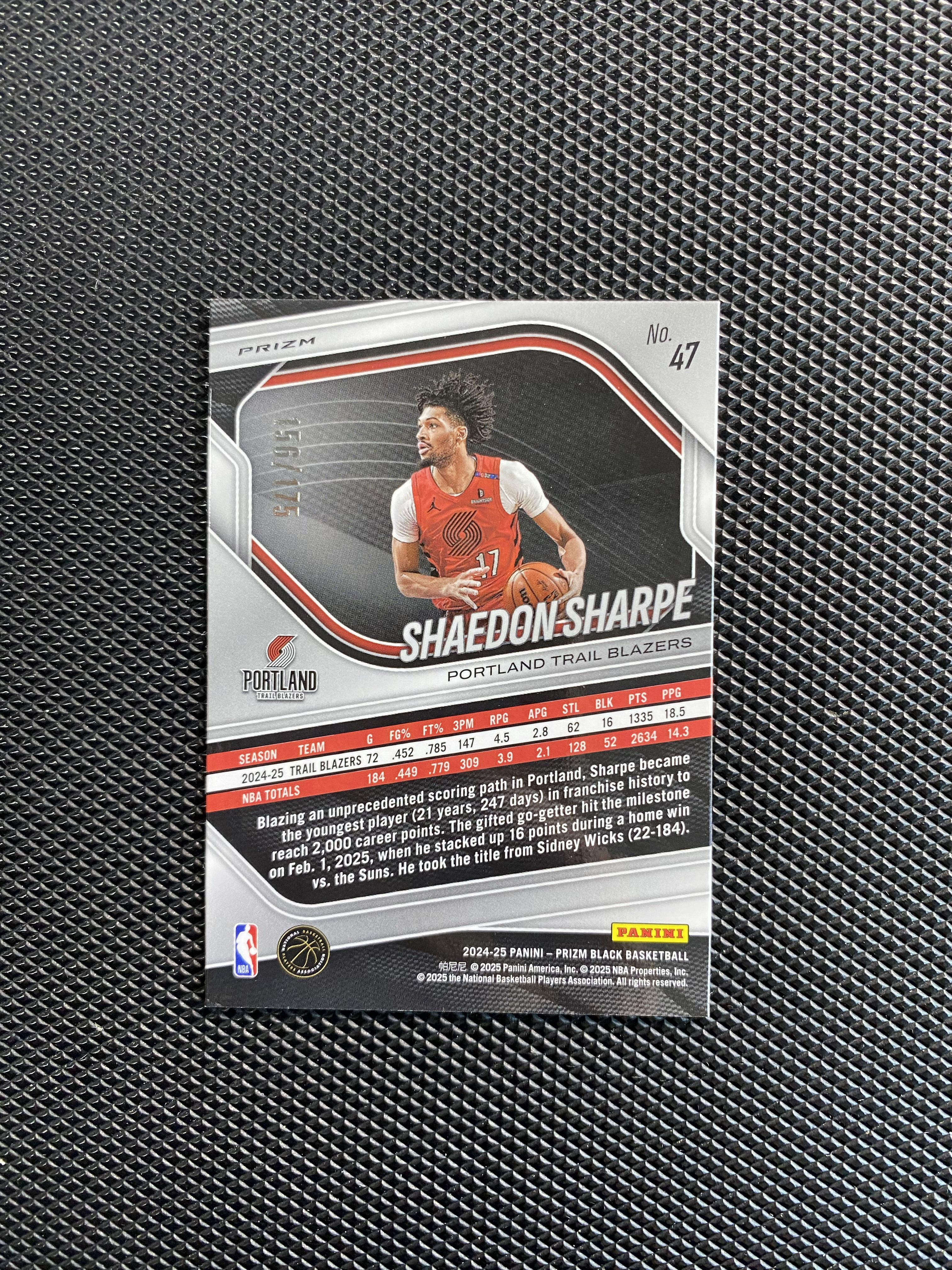 【深情拍卖】2024-25 Panini Prizm Black Shaedon Sharpe 开拓者 谢登 夏普 175编 白折 卡品如图 #js06#