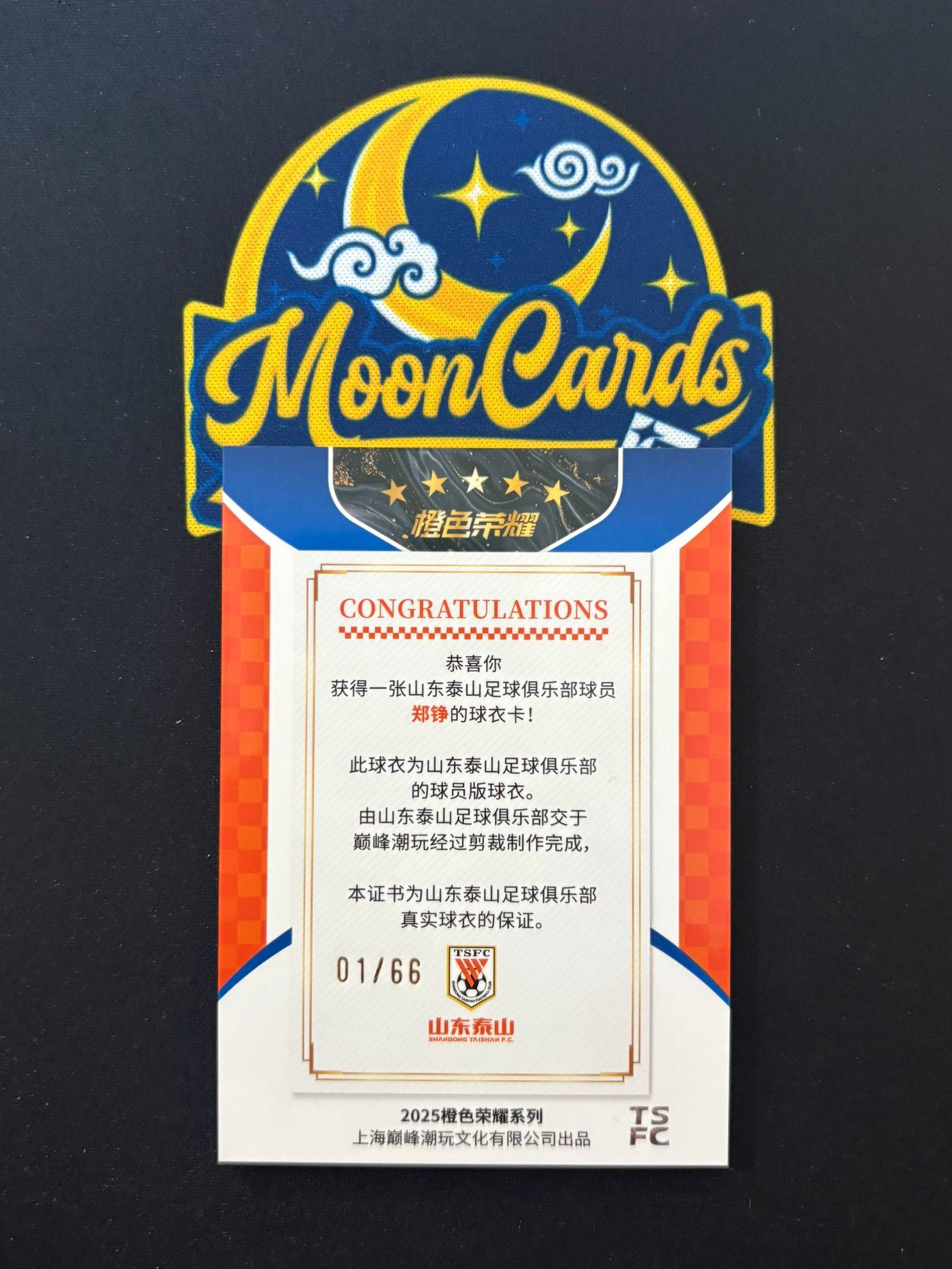 【梦卡拍卖】2025 巅峰潮玩 橙色荣耀 泰山队盒 山东鲁能 郑铮 球衣切割 物料 AU 双色 01/66编 首编 #DD# A02