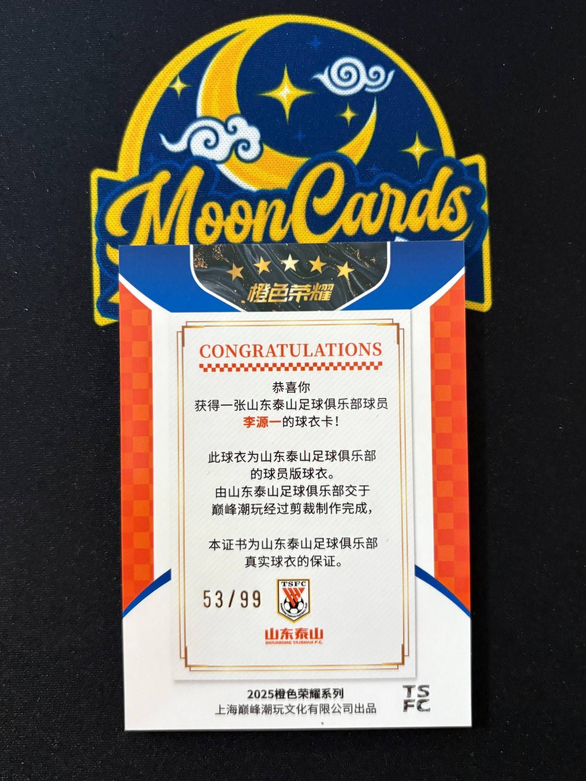 【梦卡拍卖】2025 巅峰潮玩 橙色荣耀 泰山队盒 山东鲁能 李源一 球衣切割 物料 AU /99编 #DD# A02
