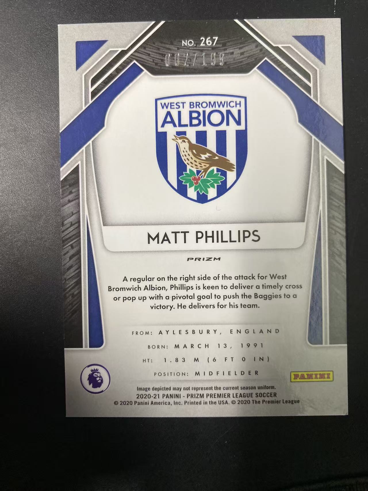 2020-21 Panini Prizm Matt Phillips 英超PZ 足球 Matt Phillips 马特 菲利普斯 西布罗姆维奇 199编 蓝折 卡品如图 微瑕 睡总