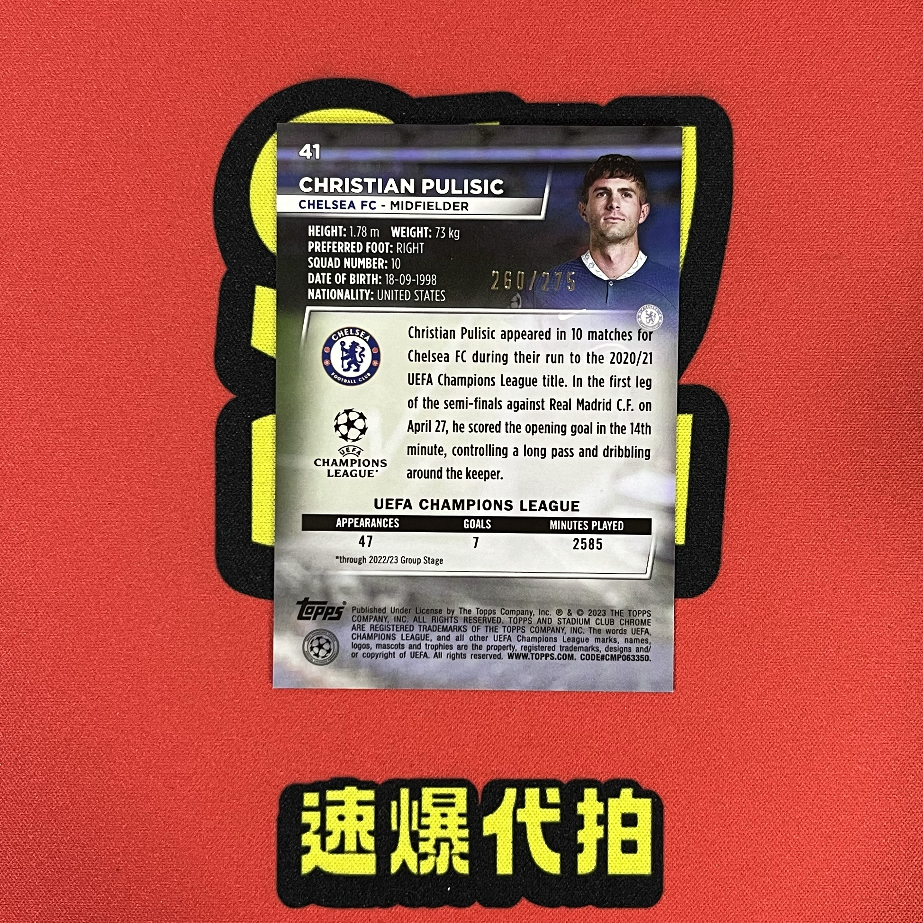 2022-23 Topps Chrome Christian Pulisic 英超 切尔西 普利西奇 竞技场 036/ 275编 绿波纹折 卡品如图 rios 【速爆代拍】
