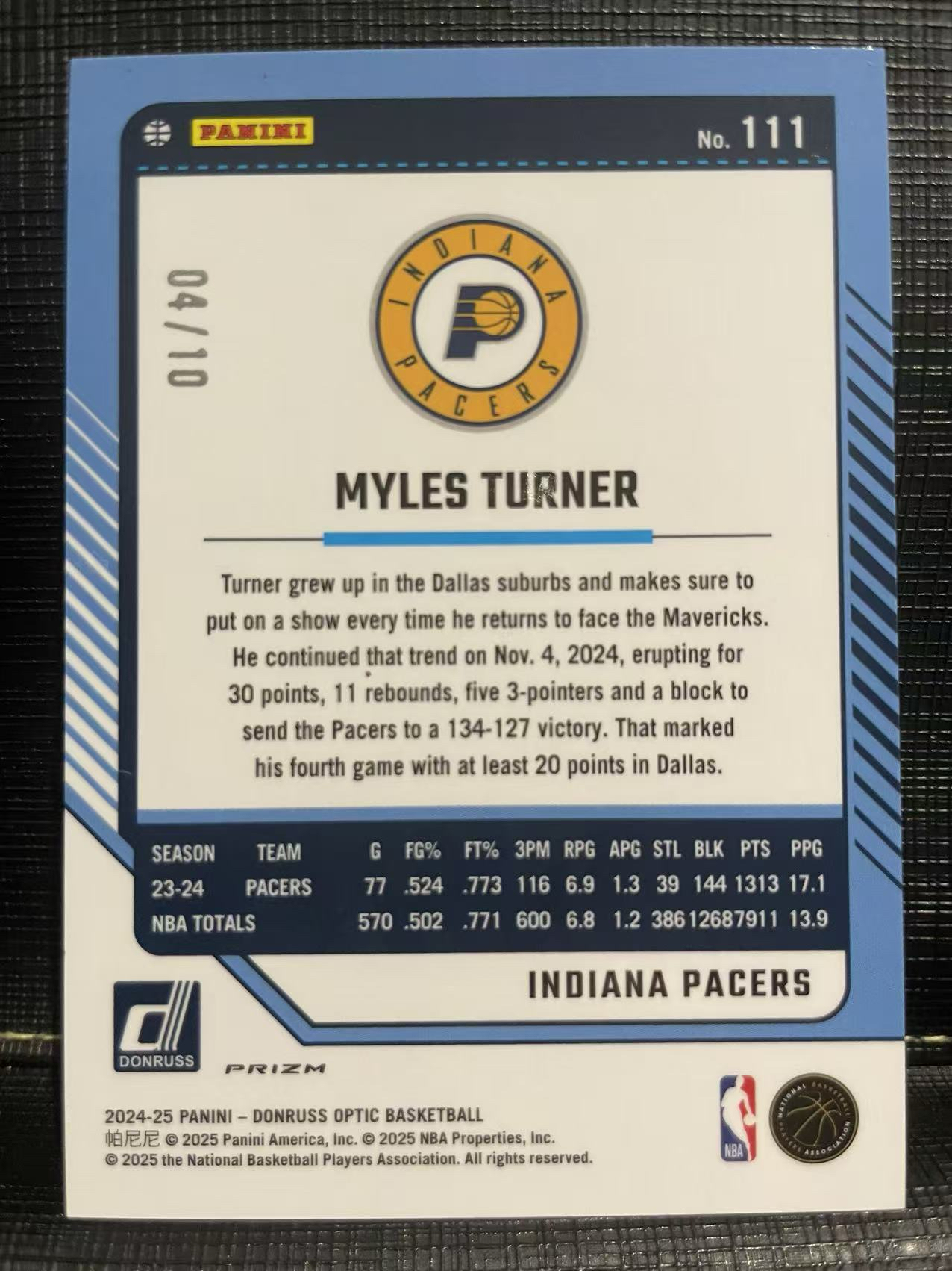 2024-25 Panini Donruss Myles Turner 步行者 迈尔斯 特纳 10编!金!爆金!金波纹!超低编!限量卡!限量带编!值得珍藏💗一卡在手 以文会友💗