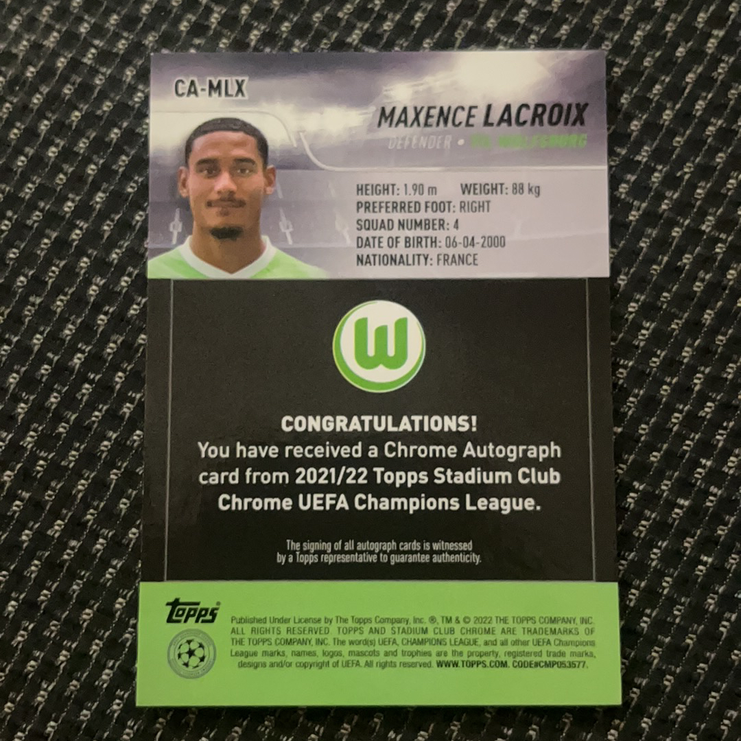 2021-22 Topps Stadium Club Chrome Maxence Lacroix 拉克鲁瓦 竞技场 签字 狼堡铁卫 登陆英超 水晶宫核心 法国🇫🇷国脚 豪门猎物 值得收藏 3