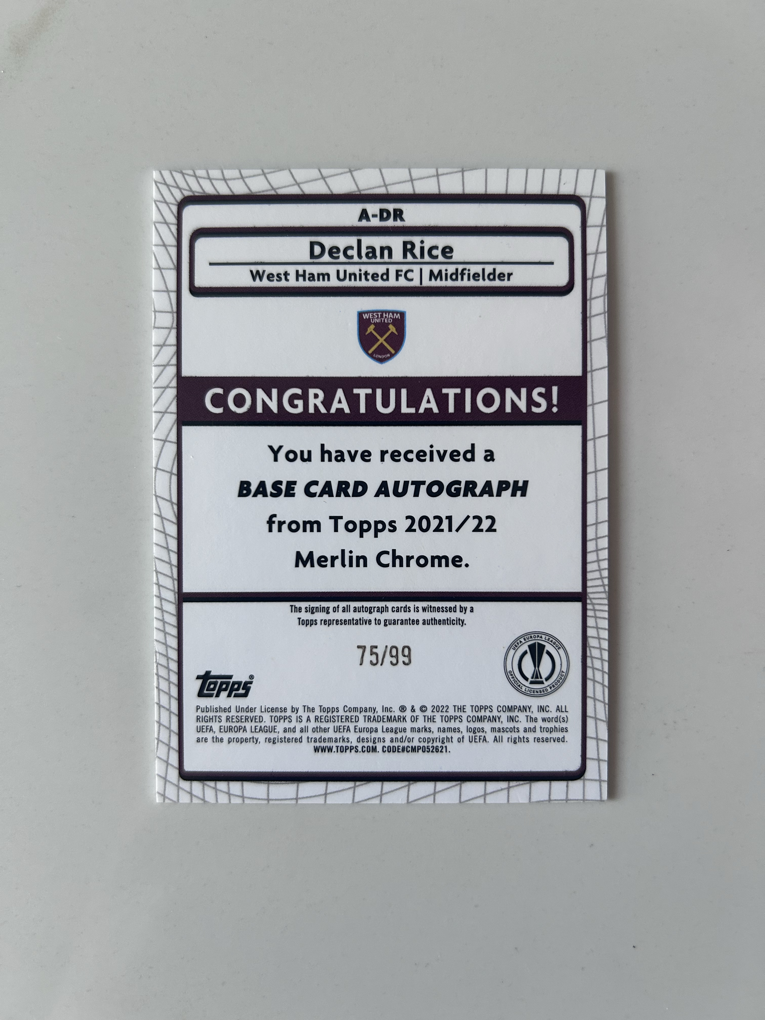 2022 Topps Merlin chrome Declan Rice 英超西汉姆联 德克兰·赖斯 99编 mojo折 签字 墨迹如图 大热 稀有 实卡精美 卡品如图 凑套收藏必入