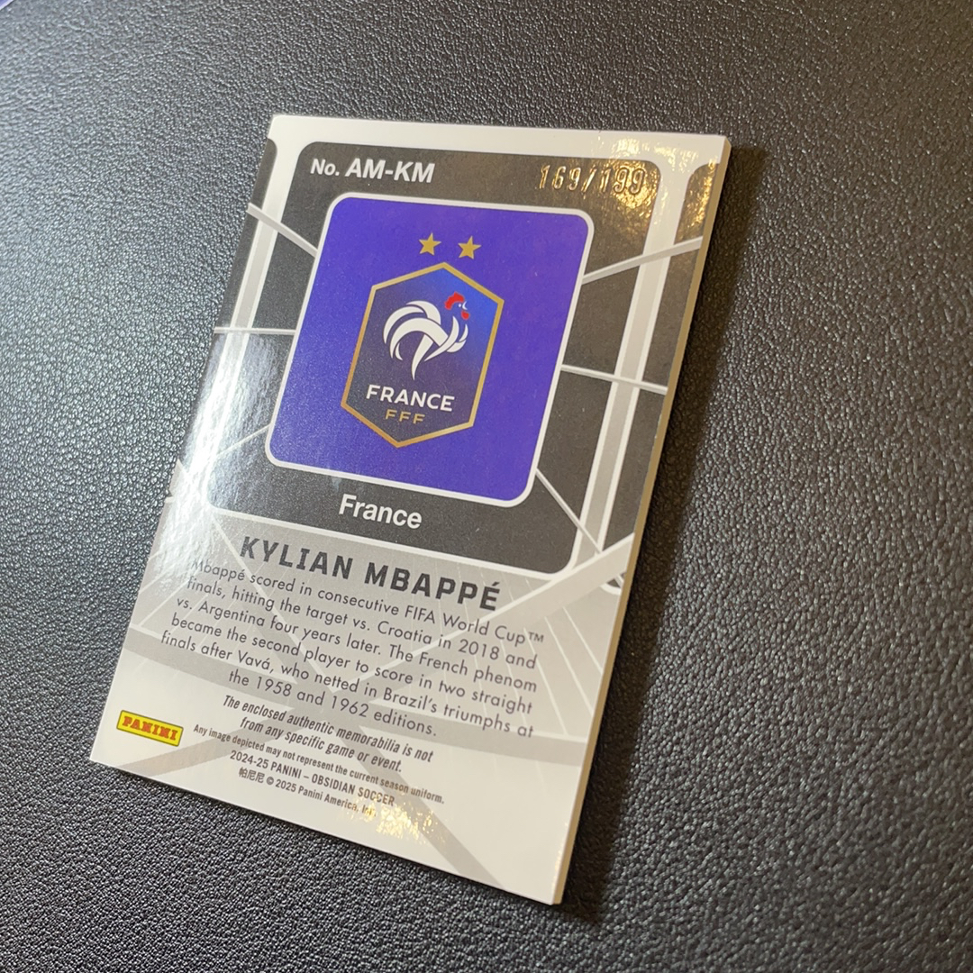 2024-25 Panini Obsidian Kylian Mbappe 法国 基利安 姆巴佩 黑曜石 球衣 物料 169/199编 亲穿 折射 皇马 大巴黎 轻印-SY0610