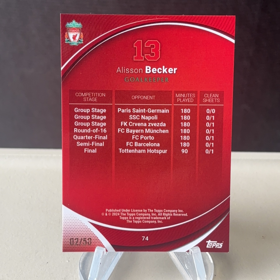 【树树拍卖 木子】2024 Topps Chrome 利物浦队盒 TC 阿利松 阿利森 巴西 金折 特卡 02/50编 Alisson Becker 卡品如图 白角 英雄 Heroes Madrid
