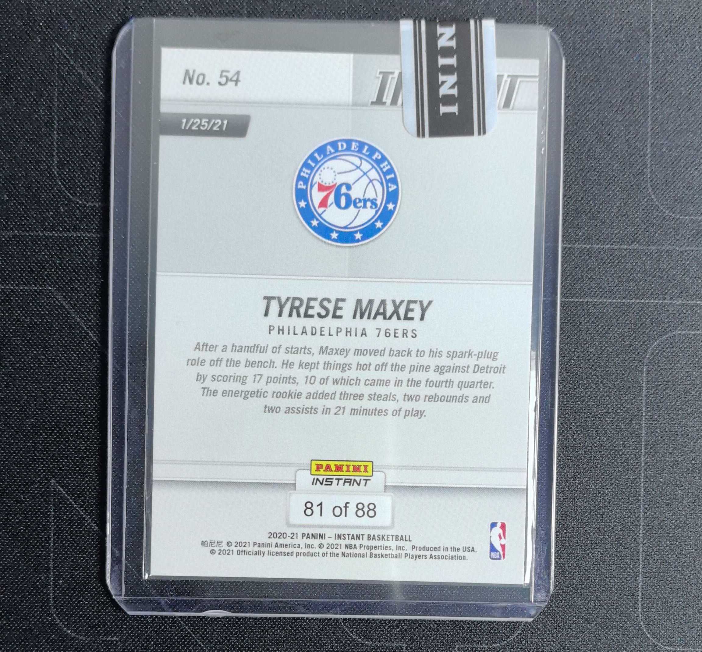 2020-21 Panini Instant Tyrese Maxey RC 76人 泰雷塞 马克西 新秀 RC 官方时刻 瞬时 特卡 88编 带编 原封卡夹 凑套必备 卡品如图