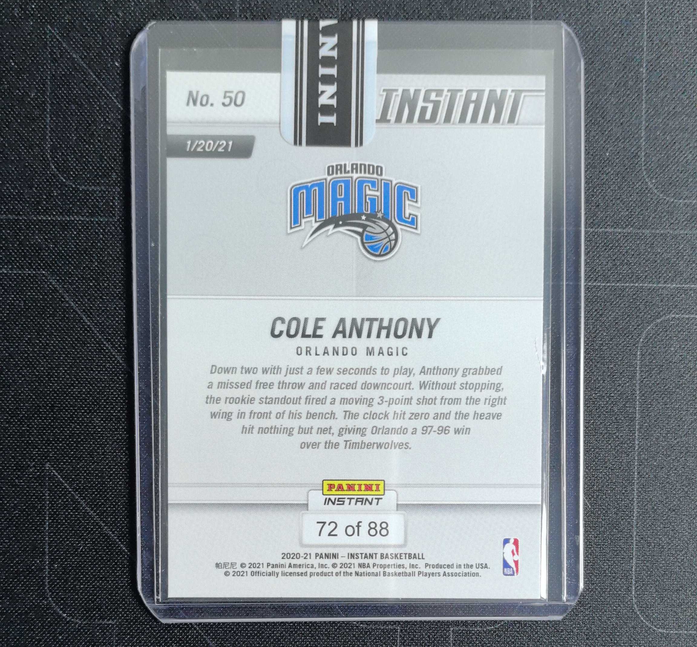 2020-21 Panini Instant Cole Anthony RC 魔术 科尔 安东尼 新秀 RC 瞬时 特卡 88编 带编 原封卡夹 凑套必备 卡品如图