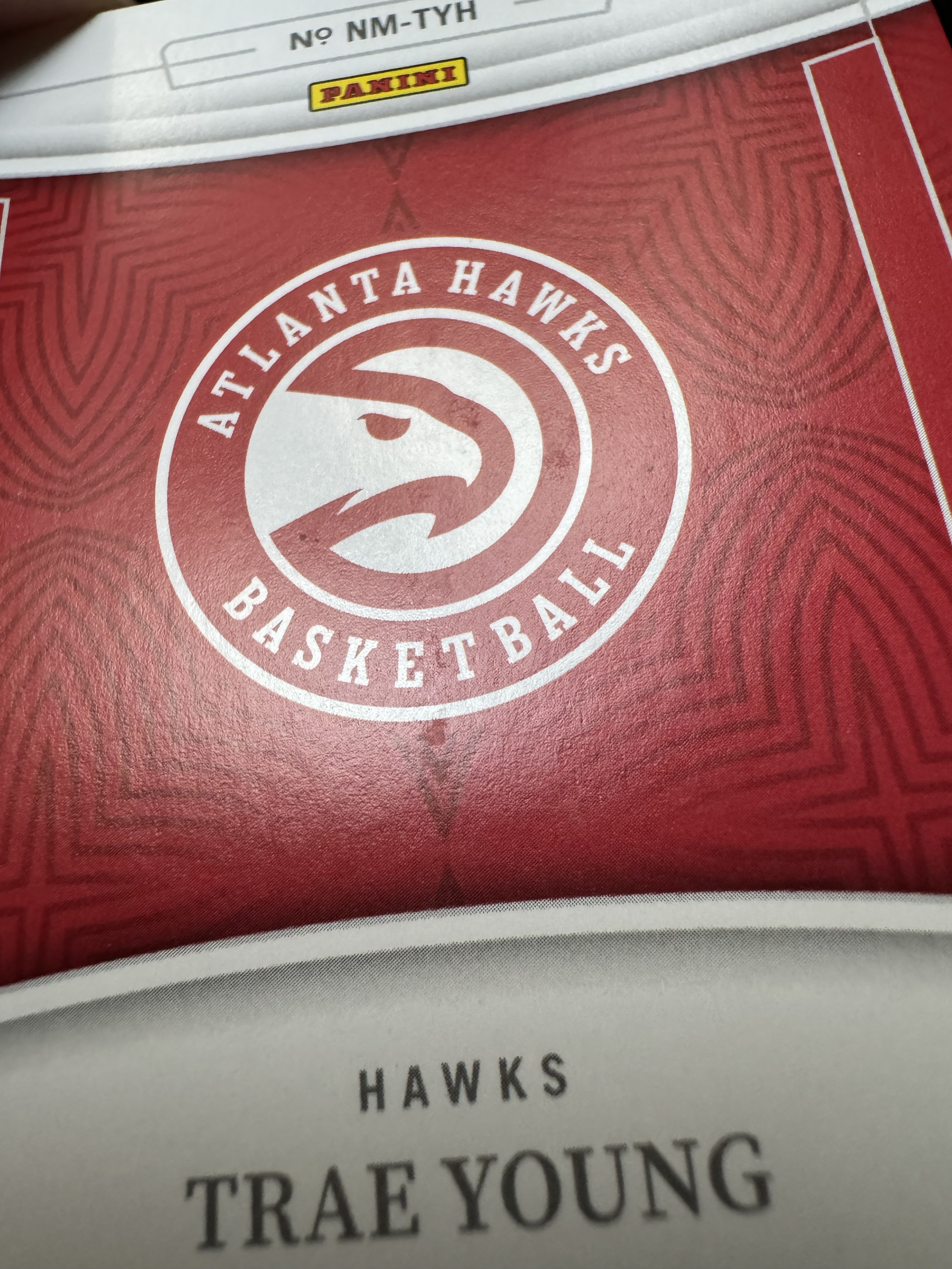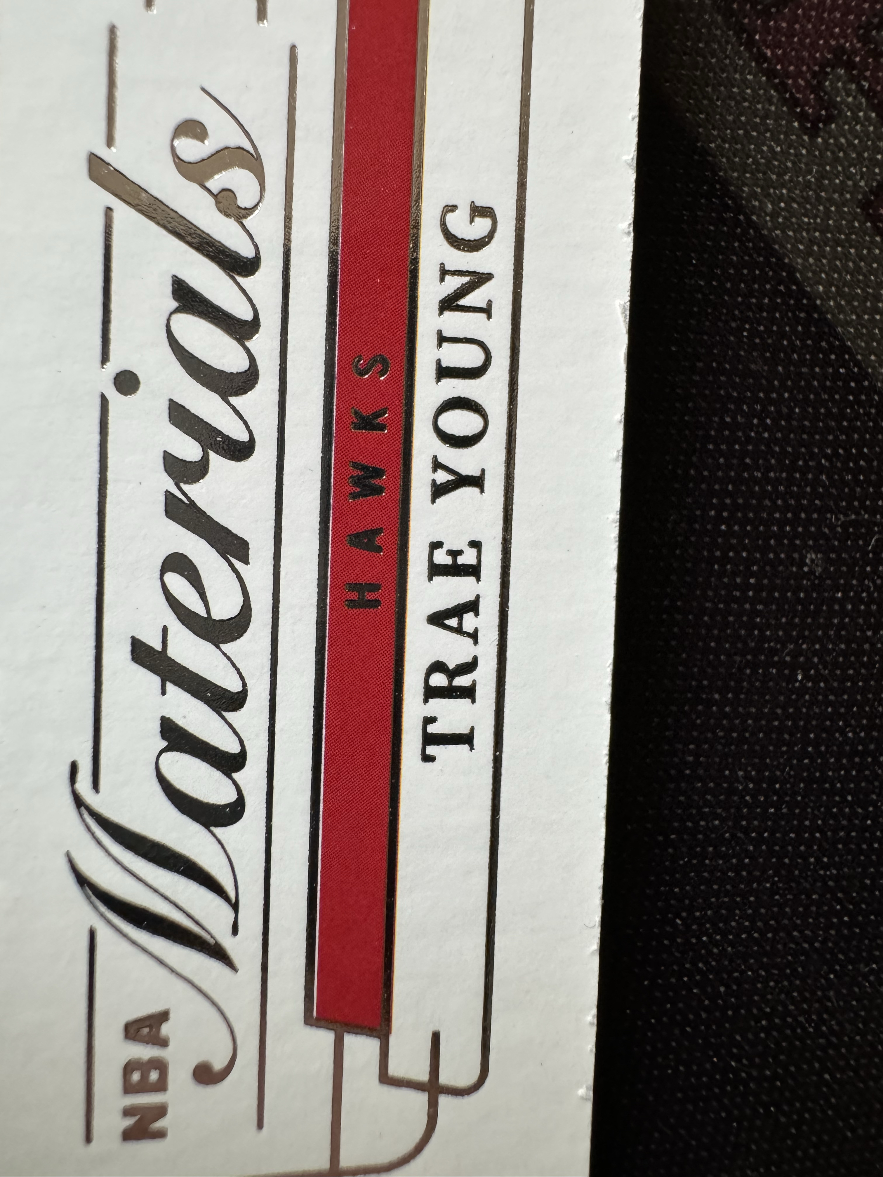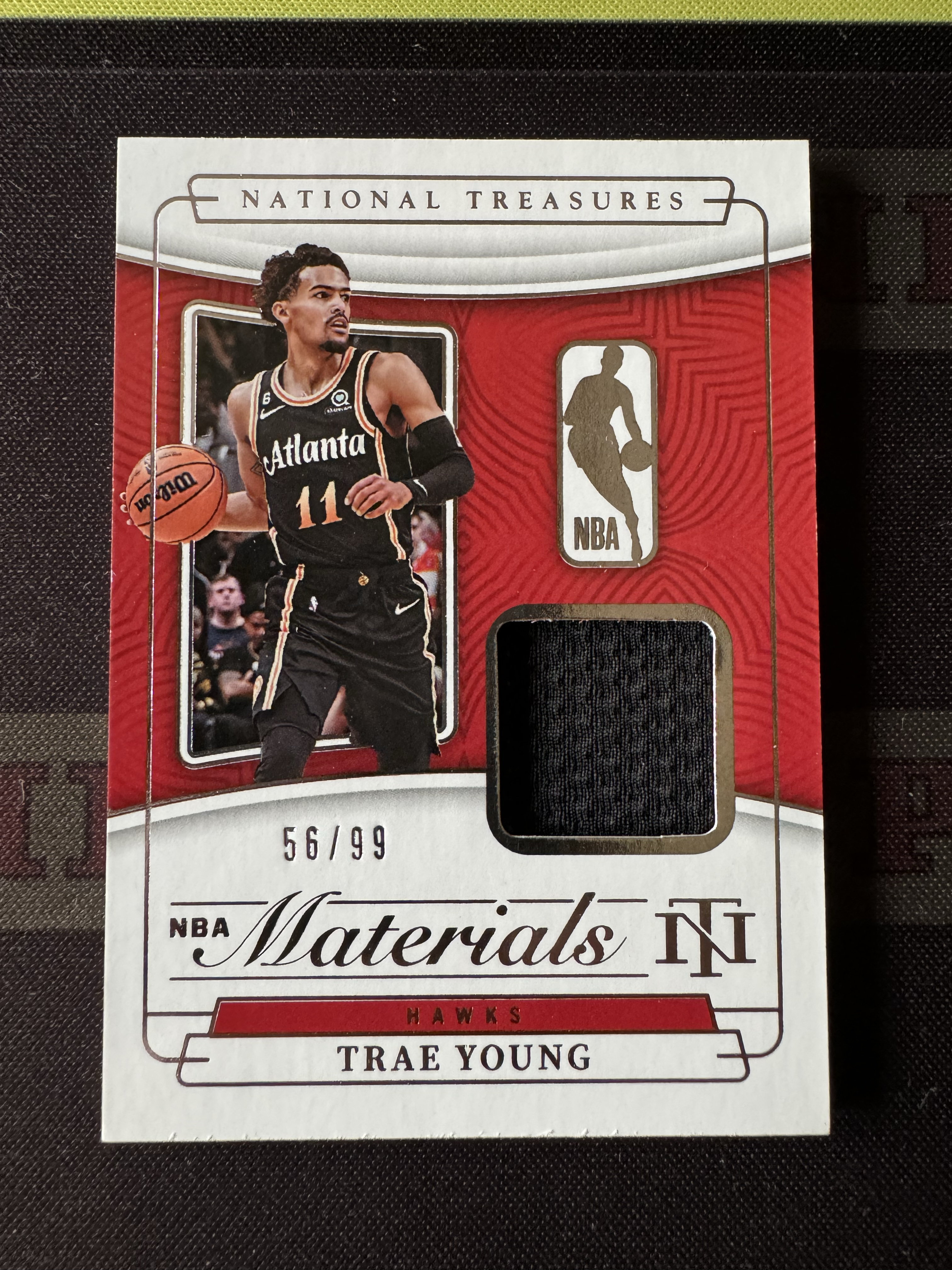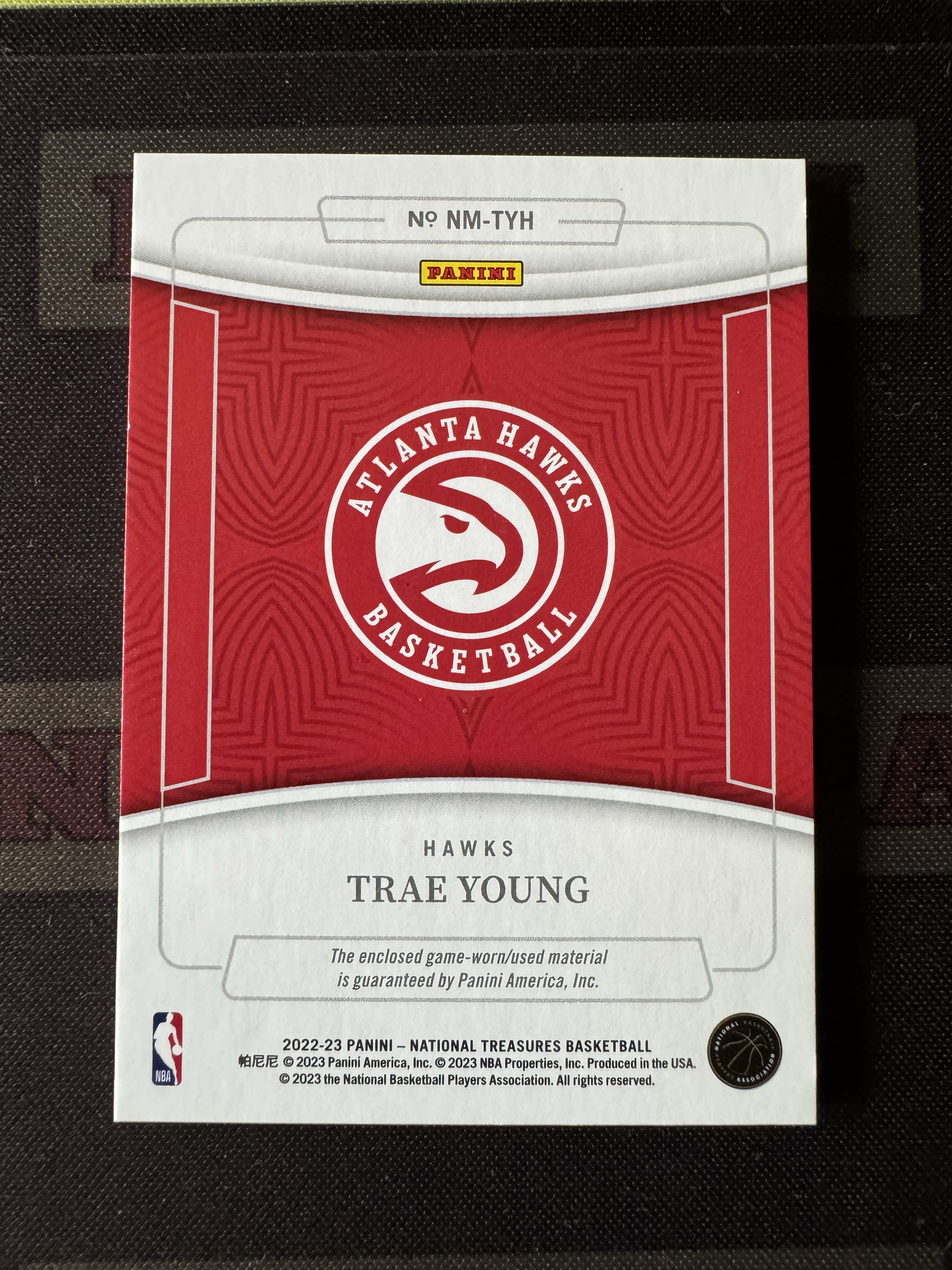 2022-23 Panini National Treasures Trae Young 特雷 杨 国宝 99编 切割 稀有比赛gu 落场亲穿有价 卡面logoman设计 老鹰队魂 卡品边角印细节如图