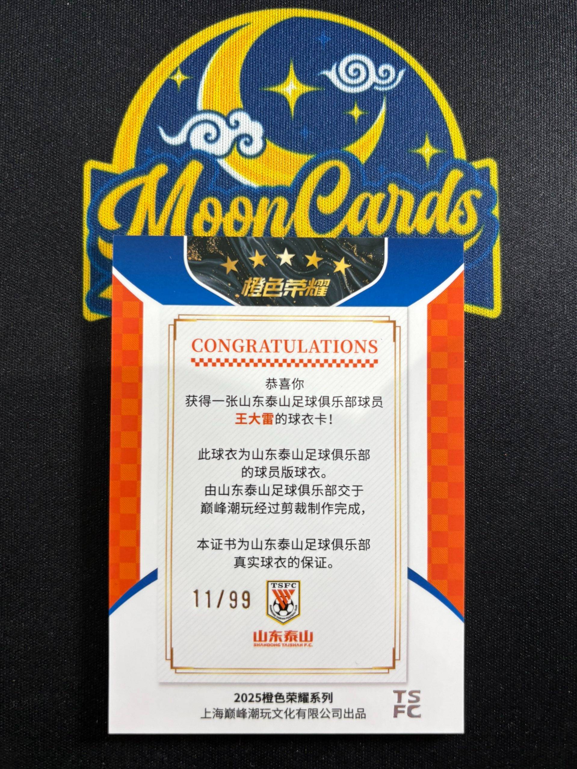 【梦卡拍卖】2025 巅峰潮玩 橙色荣耀 泰山队盒 山东鲁能 王大雷 球衣切割 物料 11/99编 #DD# 乐哥