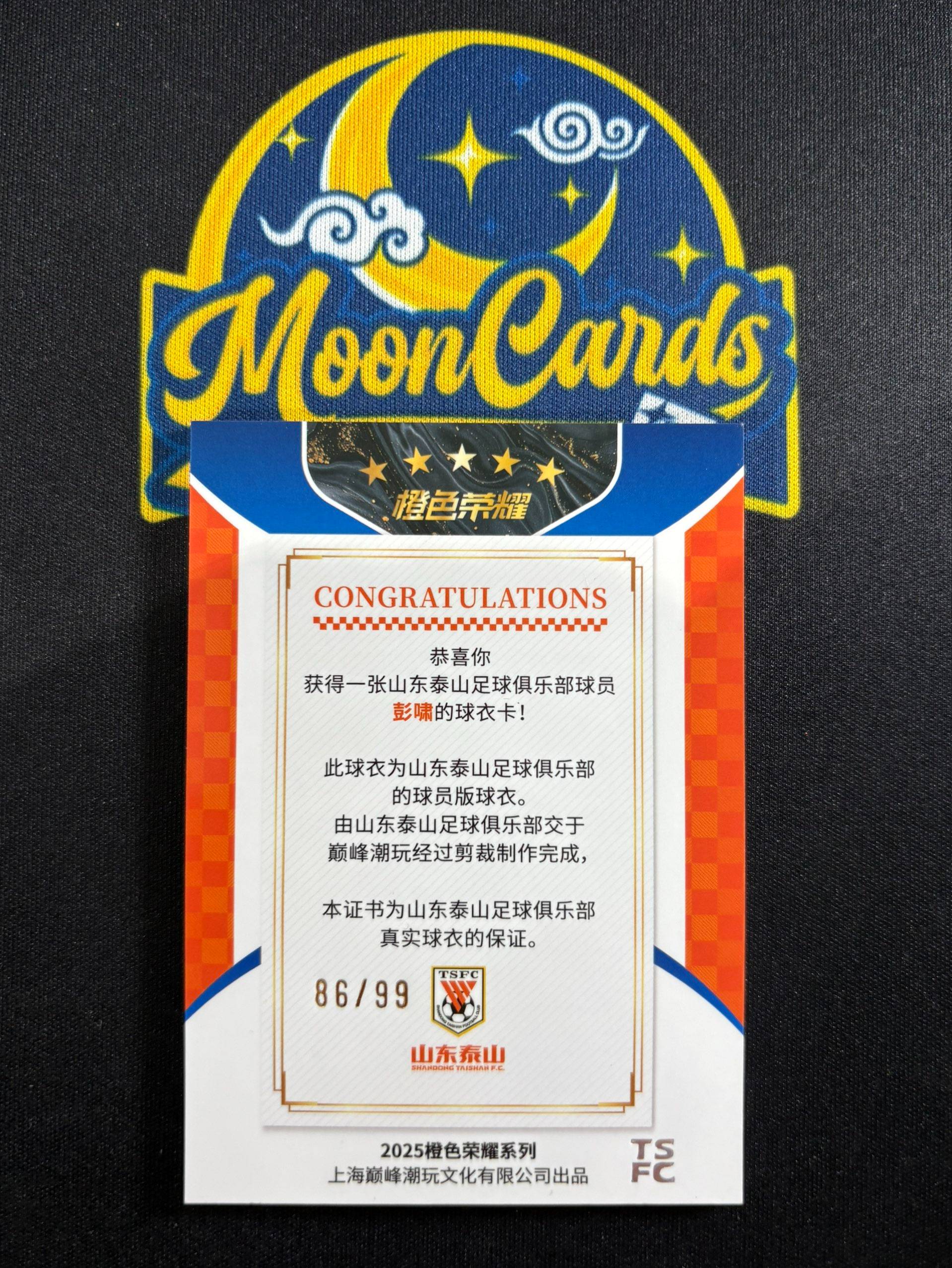 【梦卡拍卖】2025 巅峰潮玩 橙色荣耀 泰山队盒 山东鲁能 彭啸 球衣切割 物料 86/99编 #DD# 乐哥