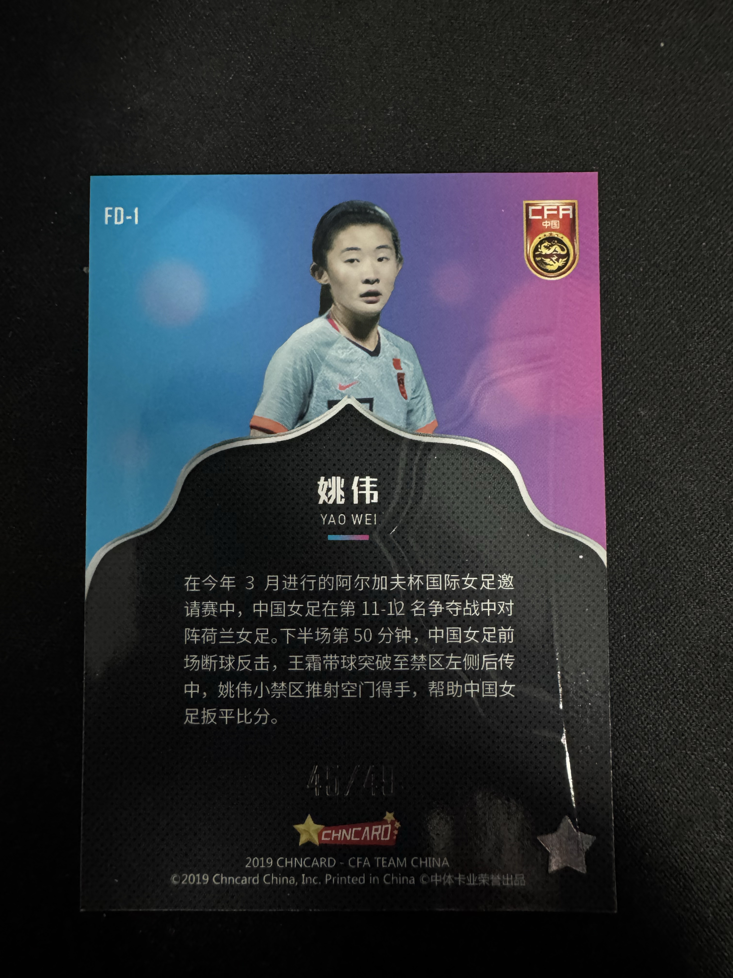 【农夫】2019 中体卡业 CFA TEAM CHINA 老卡 女足 姚伟 45/49编 紫折 点点折 折射 卡品如图《唐1128