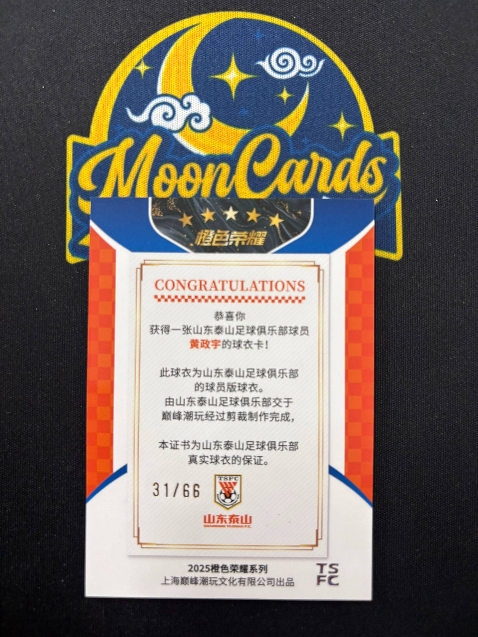 【梦卡拍卖】2025 巅峰潮玩 橙色荣耀 泰山队盒 山东鲁能 黄政宇 球衣切割 物料 双色 31/66编 #DD# A02