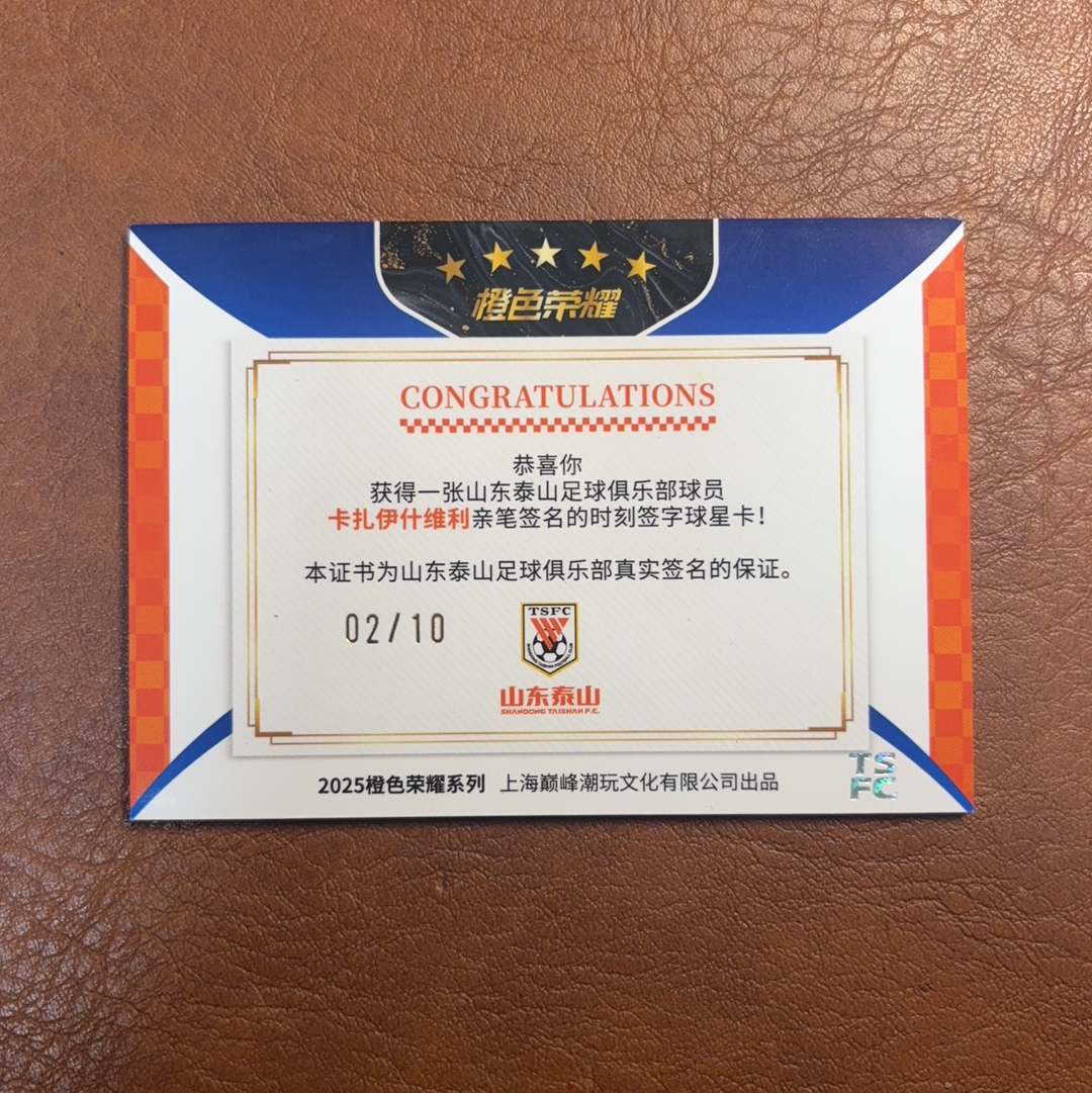 2025 巅峰潮玩 山东泰山队盒 卡扎伊什维利 【耳朵拍卖】山东泰山 卡扎伊什维利 签字 金笔 卡签 橙色荣耀 泰山时刻签 金折 平行 超低编 2/10编 收藏必入 微瑕见图 向阳