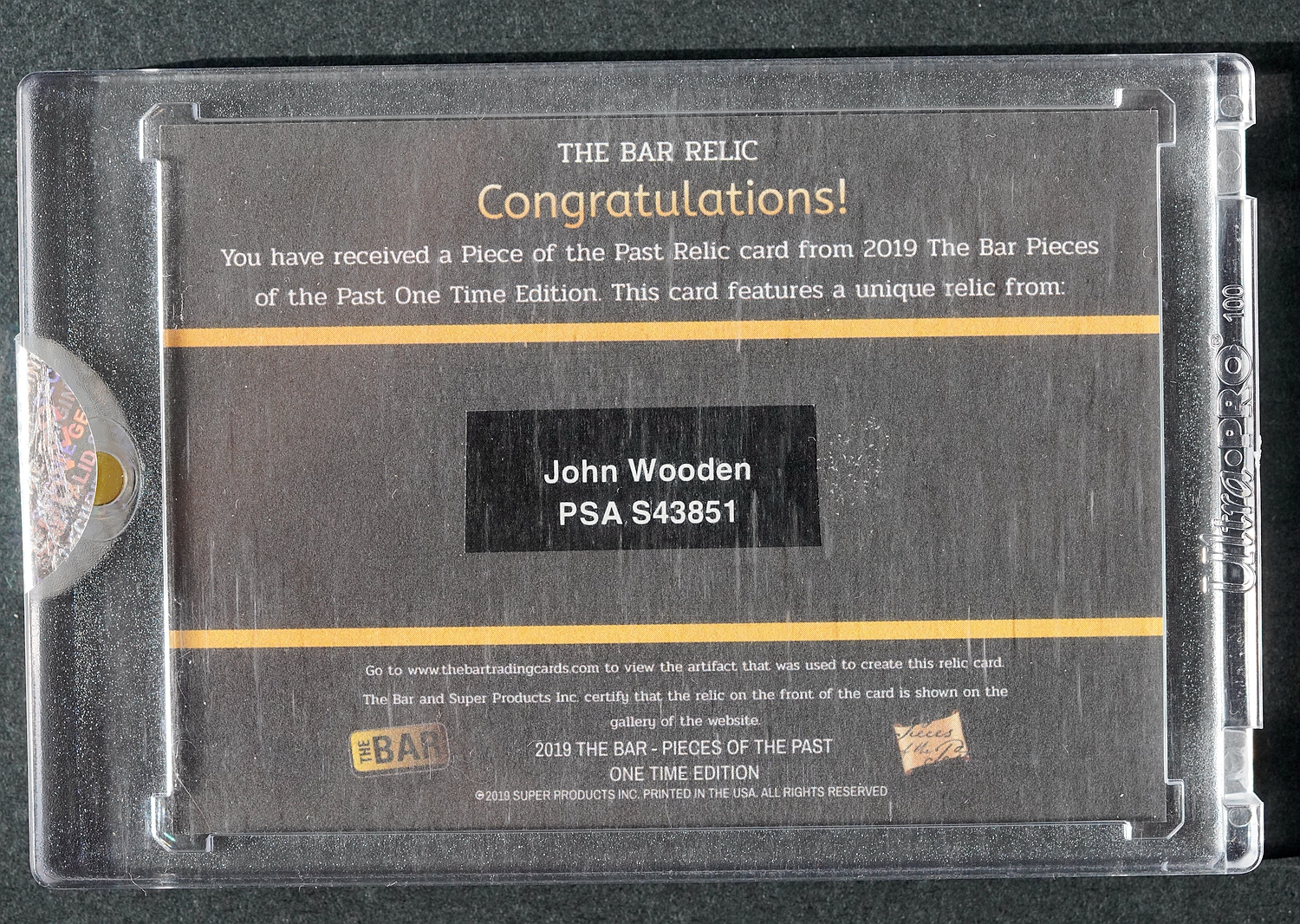 2019 Super Products PIECES OF THE PAST John Wooden THE BAR 系列 原封砖 美国历史上最著名篮球教练 鼻祖!约翰 伍登 签字卡 (PSA评级)